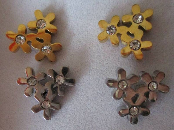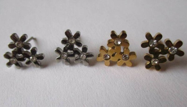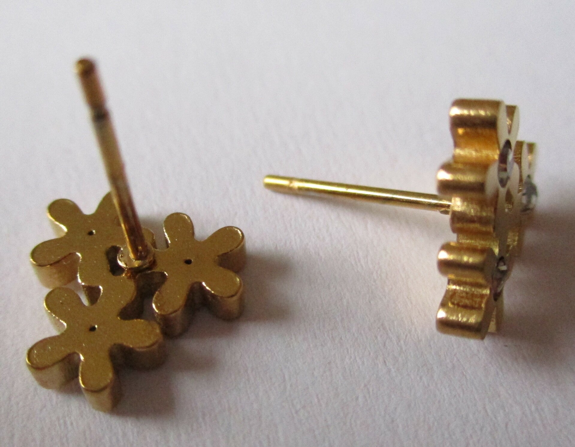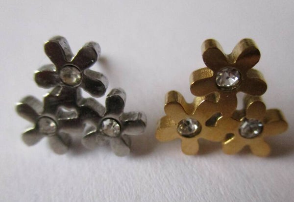 Modern, strak en toch klassiek vorm gegeven roestvrij stalen (RVS of stainless steel) oorstekers. De oorstekers hebben de vorm van 3 bloemen met een hart van een stras steentje, waardoor het een klein bling effect heeft. De bloemen zijn ongeveer 12 x 12 mm groot en alleen nog in goudkleur. De oorstekers zijn veilig te dragen door mensen met een metaal allergie.