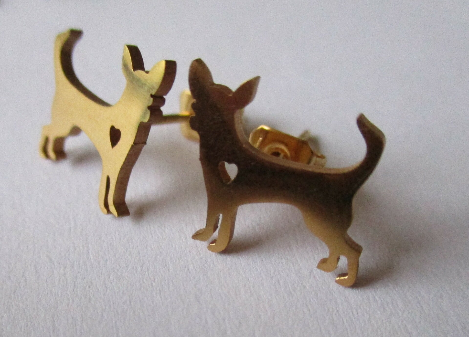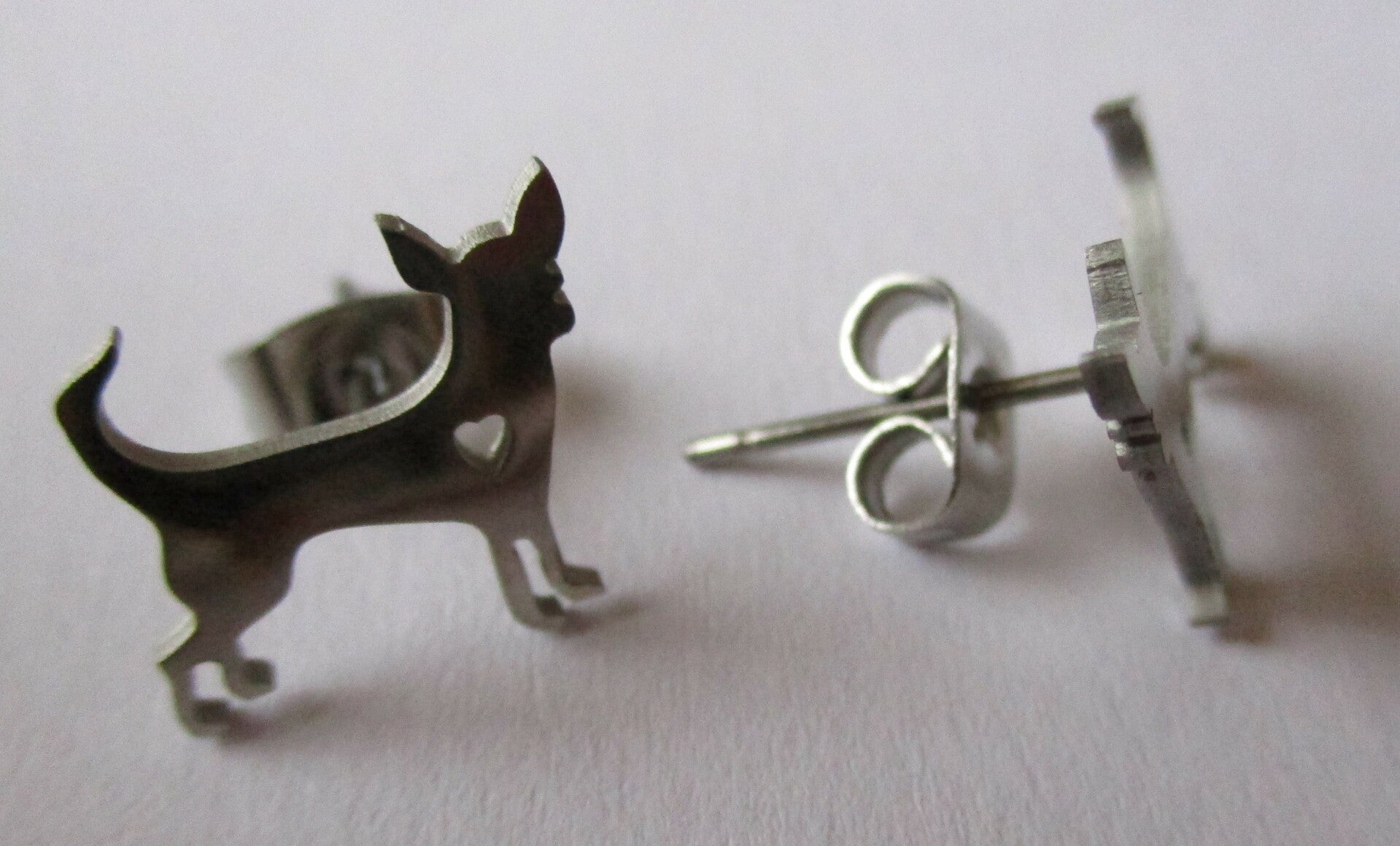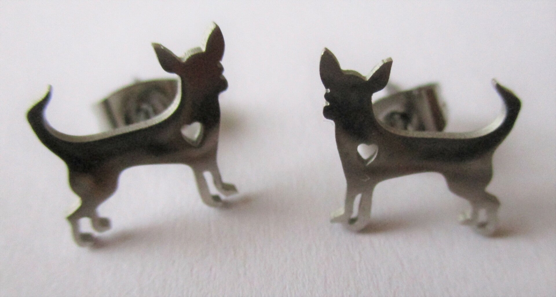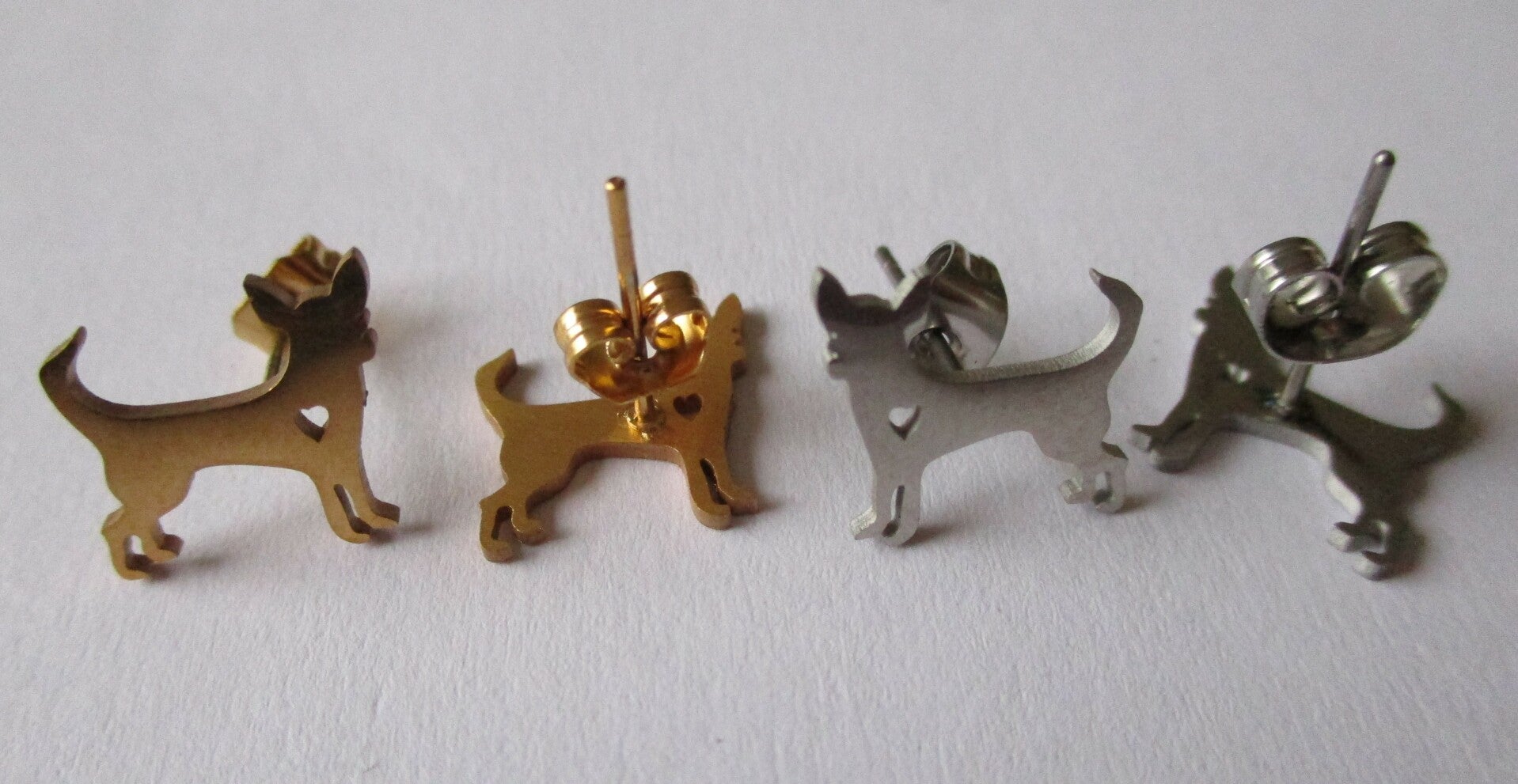 Roestvrij stalen oorstekers (RVS of stainless steel), die veilig te dragen zijn door mensen met een metaal allergie met een hondje erop. De hondjes hebben een klein hartje en zijn verder strak vormgegeven. De hondjes zijn er in goud of zilverkleurig en ongeveer 12 x 12 mm groot. Geef bij uw bestelling aan welke u graag wilt ontvangen.