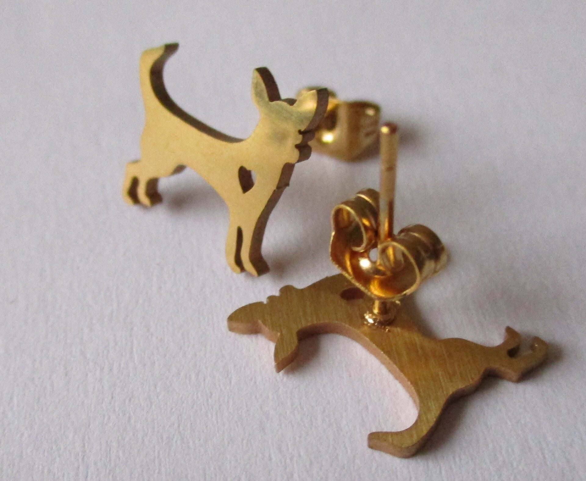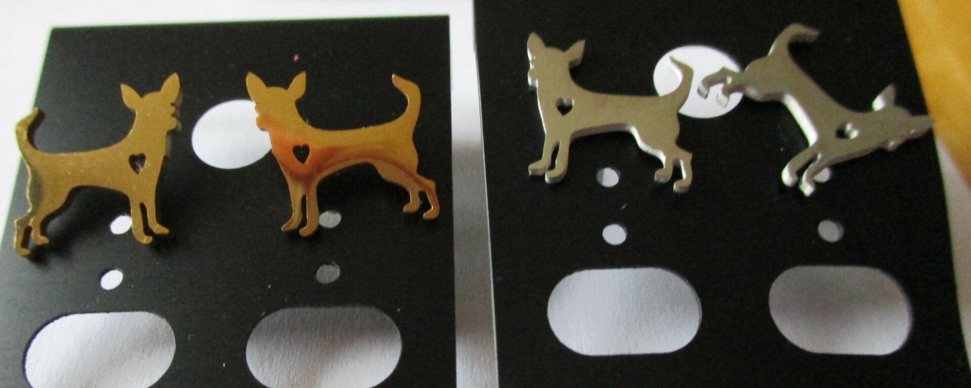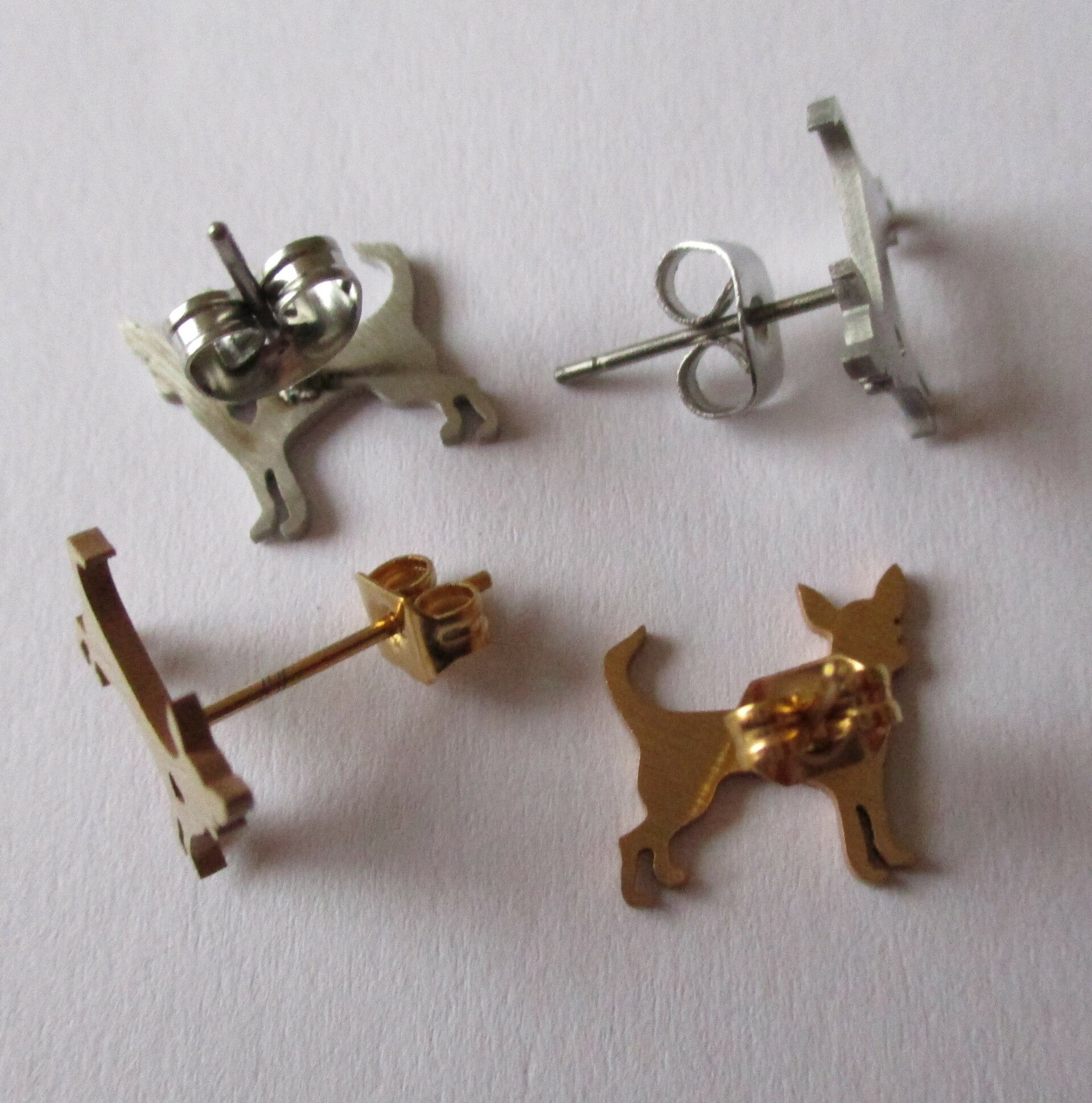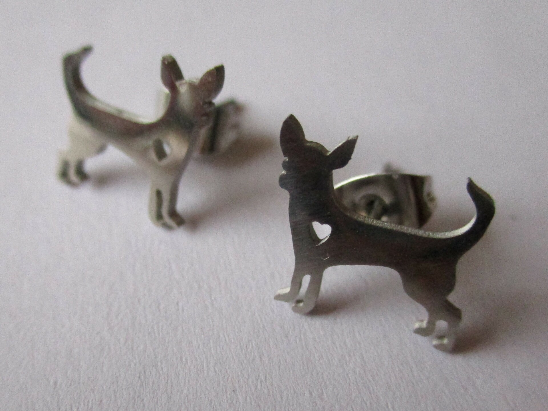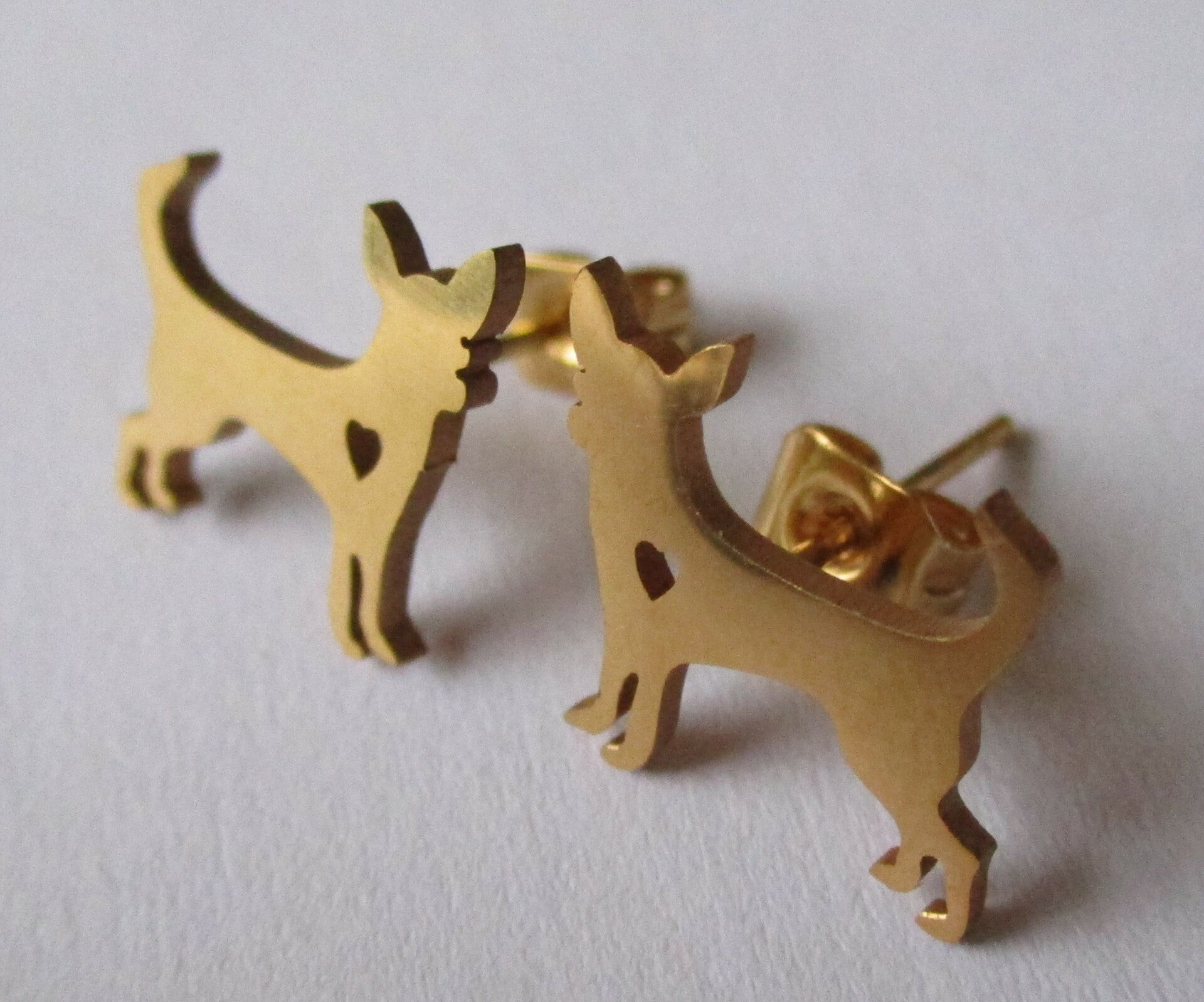 Roestvrij stalen oorstekers (RVS of stainless steel), die veilig te dragen zijn door mensen met een metaal allergie met een hondje erop. De hondjes hebben een klein hartje en zijn verder strak vormgegeven. De hondjes zijn er in goud of zilverkleurig en ongeveer 12 x 12 mm groot. Geef bij uw bestelling aan welke u graag wilt ontvangen.