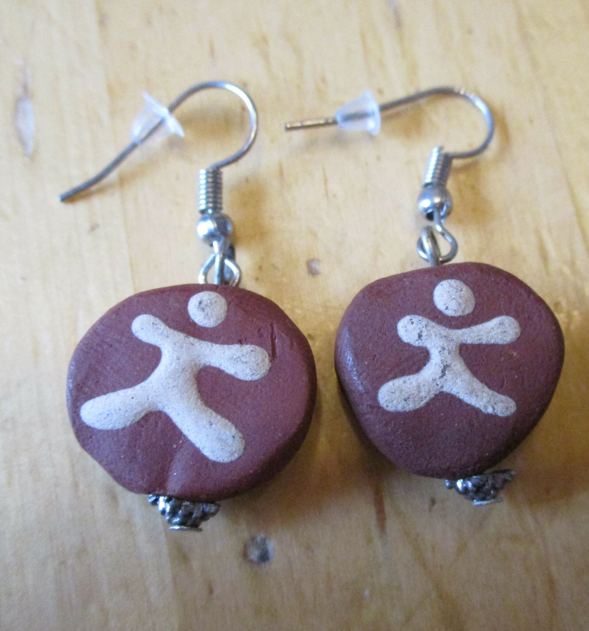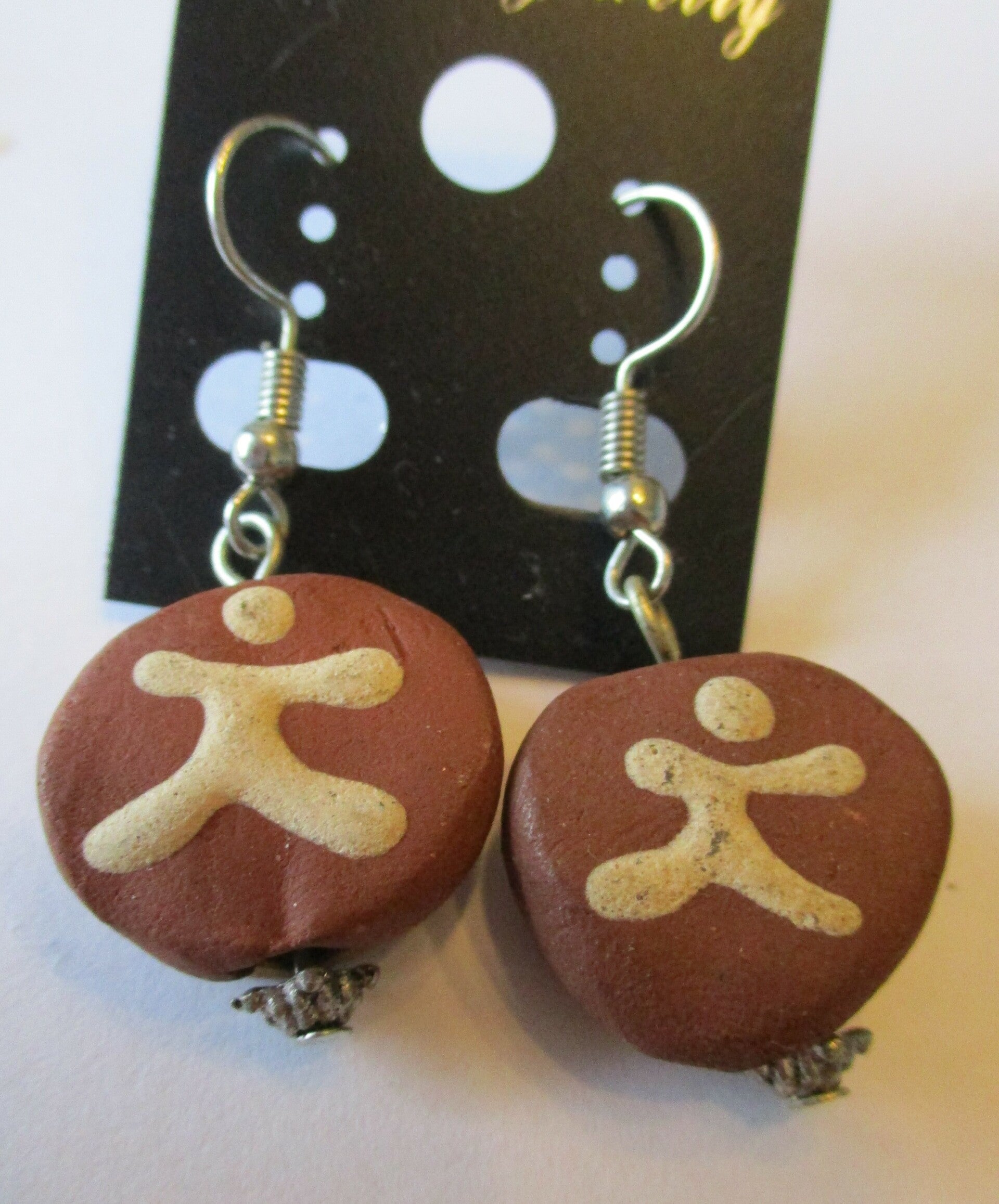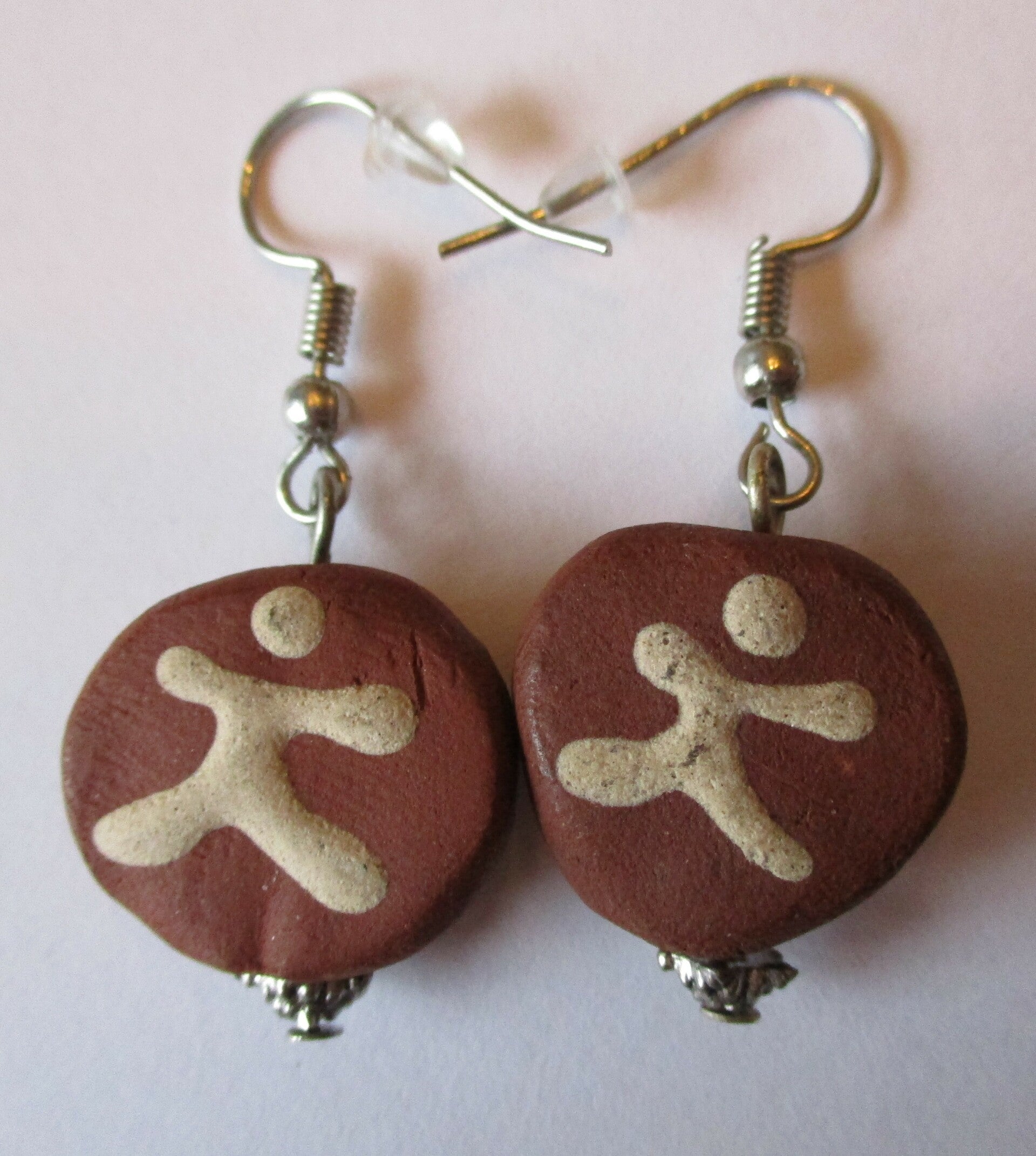 Oorbellen gemaakt van keramiek in een okergele en terracotta kleur. Aan beide zijden van de kraal is een soort poppetje in cremekleurig keramiek gemaakt. De oorbel heeft een heel natuurlijke uitstraling, goed passend bij een outfit in aarde tinten.