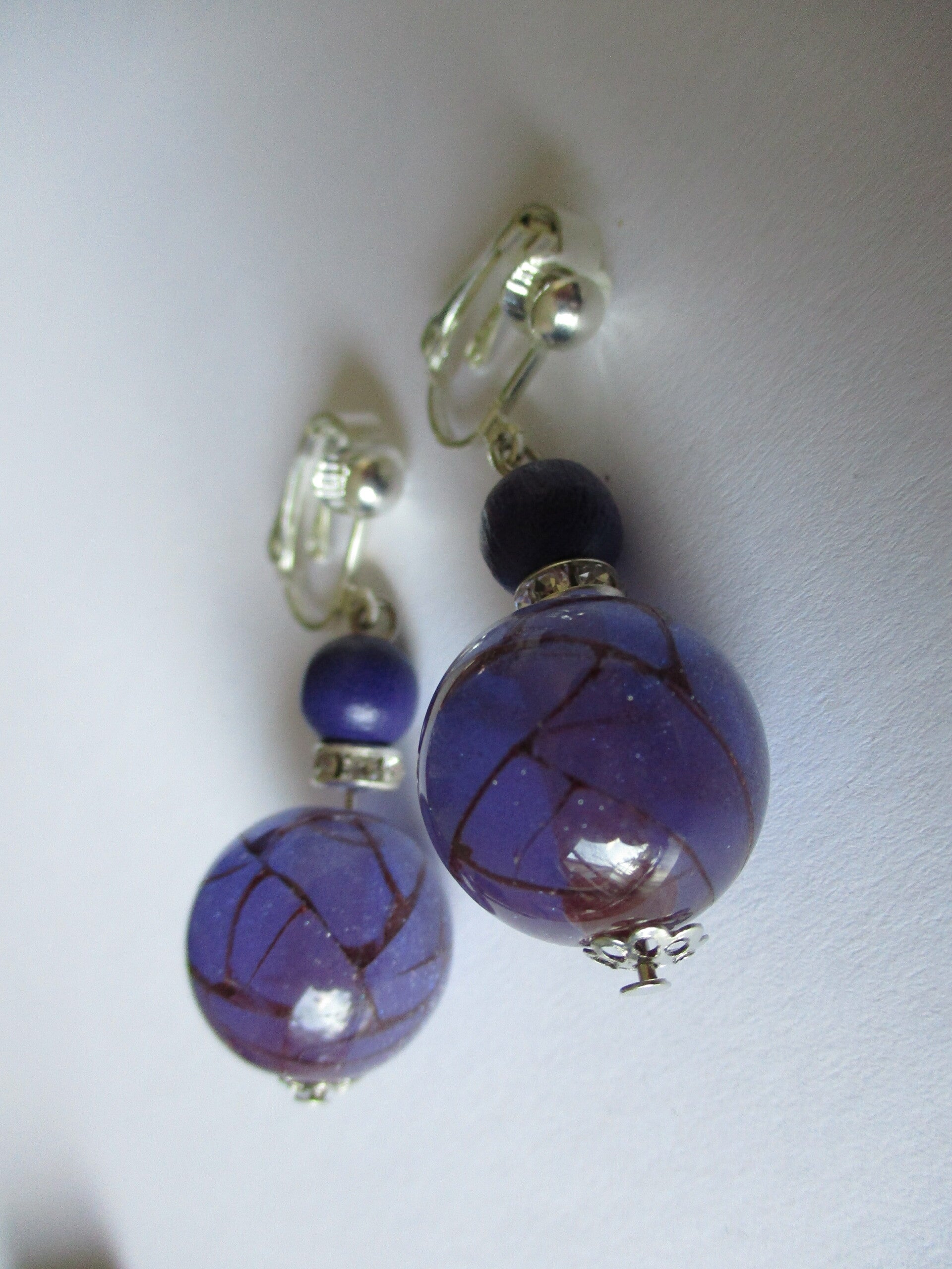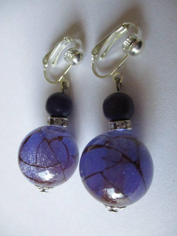 Aparte paarse oorbellen, gemaakt van kunststof kralen met een soort gemarmerd effect erin, een houten paarse kraal en ertussen een stras rondelle kraal. Perfect voor bij een zwarte, bruine of witte blouse of jurk.