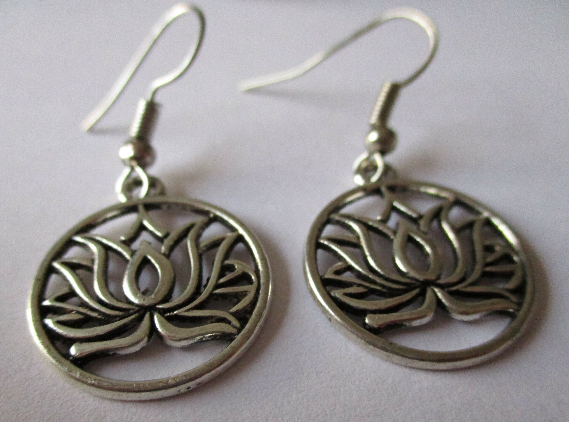 Klassiek ogende, niet al te opvallende, zilverkleurige oorbellen met een hanger in de vorm van een lotusbloem. De hanger is 22 mm groot. De hanger en haakjes zijn gemaakt van nikkelvrij materiaal en de haakjes kunnen bij bestelling worden verwisseld.