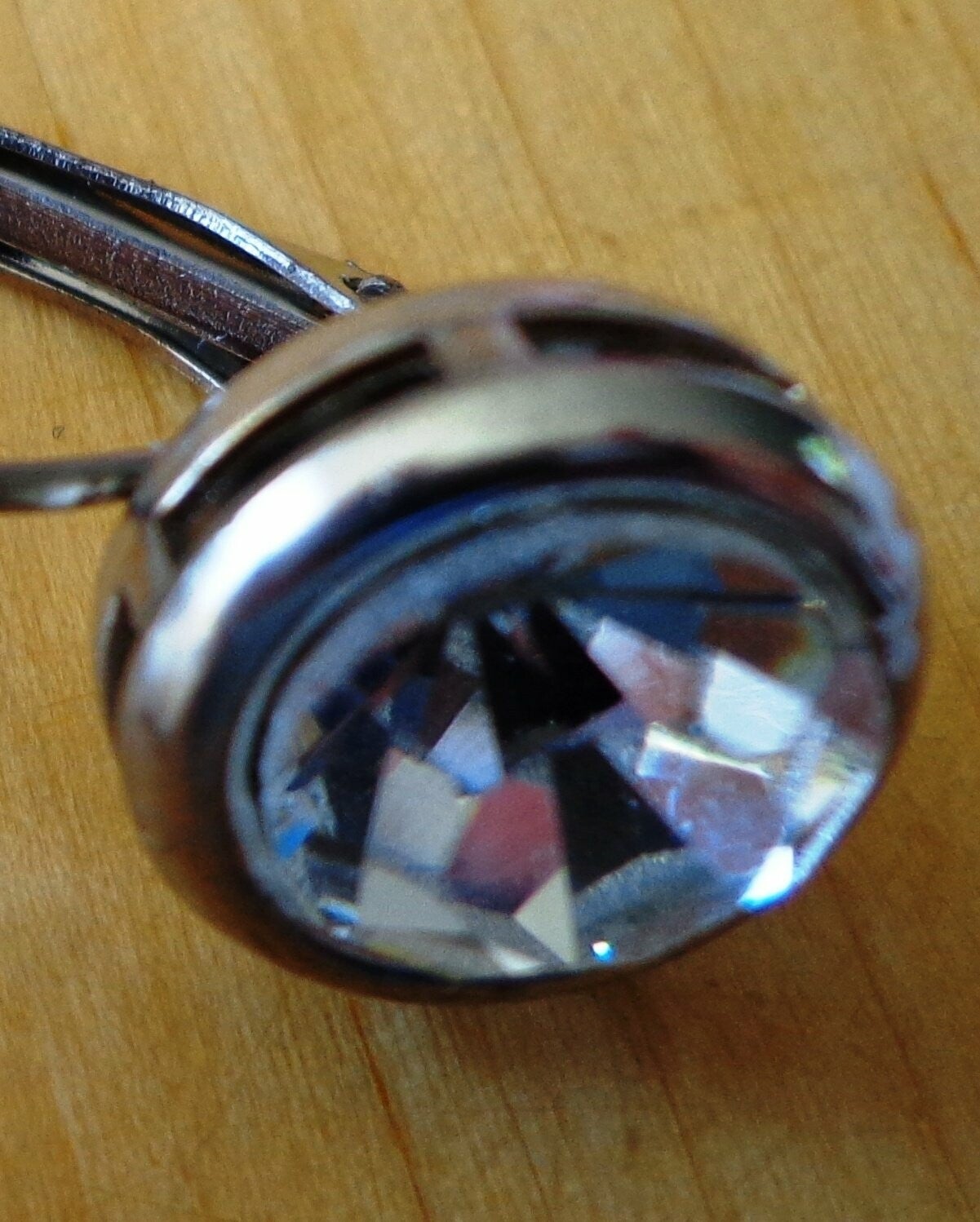 Een heel eenvoudige, maar mooi paar oorbellen met een grote ronde strass steen als detail. De oorbellen passen overal bij en hebben een klaphaakje. De oorbellen zijn ongeveer 1 cm lang.
