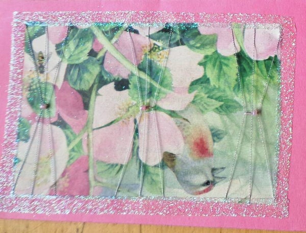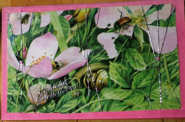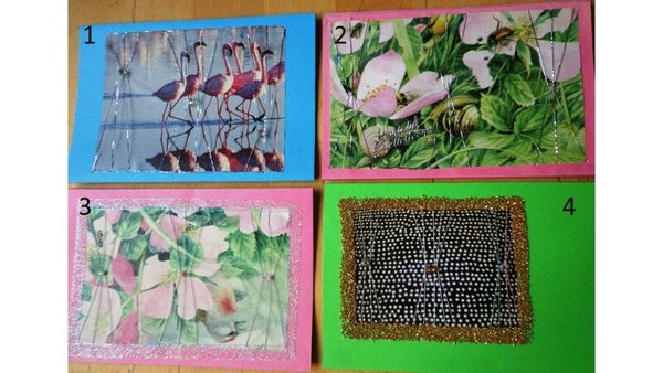 Aparte kaarten met een plaatje waarover draad is gespannen dat met een klein kraaltje is samengebonden.