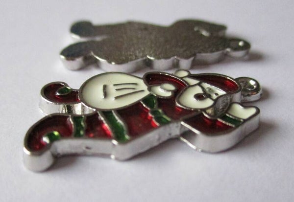 Een hangertje in de vorm van een kerstmannetje, gemaakt van zilverkleurig metaal met groen, rood en wit epoxy. De hanger is 23 x 12 mm groot.