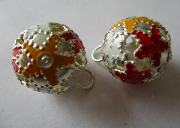 Een grappige hanger voor uw kerstsieraad. Een zilverkleurige nikkelvrije metalen bal met sterretjes in wit, geel en rood emaille en gaatjes ertussen. In de bol zit een belletje, wat redelijk goed hoorbaar is. De bol is 20 x 17 mm groot, inclusief oog.