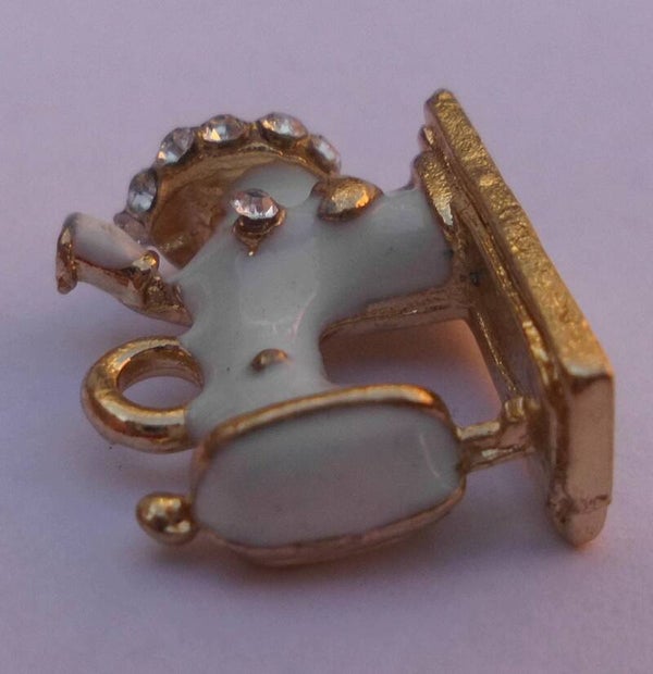 Een hangertje in de vorm van een naaimachine van 1,7 x 1,5 cm groot. De hanger is gemaakt van roze goudkleurig metaal met een laagje wit emaille en wat strass steentjes.