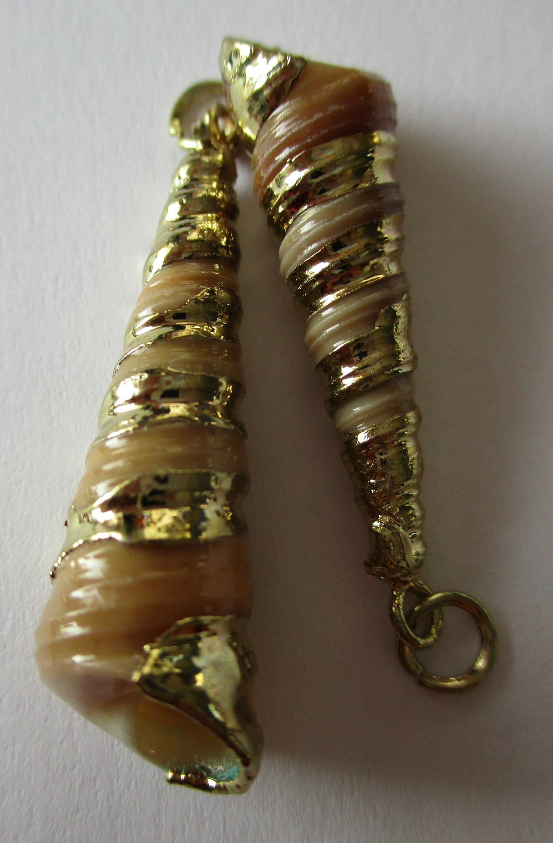 Een mooie langwerpige schelp met gedraaid roze gouden randjes eromheen. De hanger is ongeveer tussen de 21 en 24 mm lang. Het is een natuurproduct dus kan een beetje verschillen van vorm of grootte.