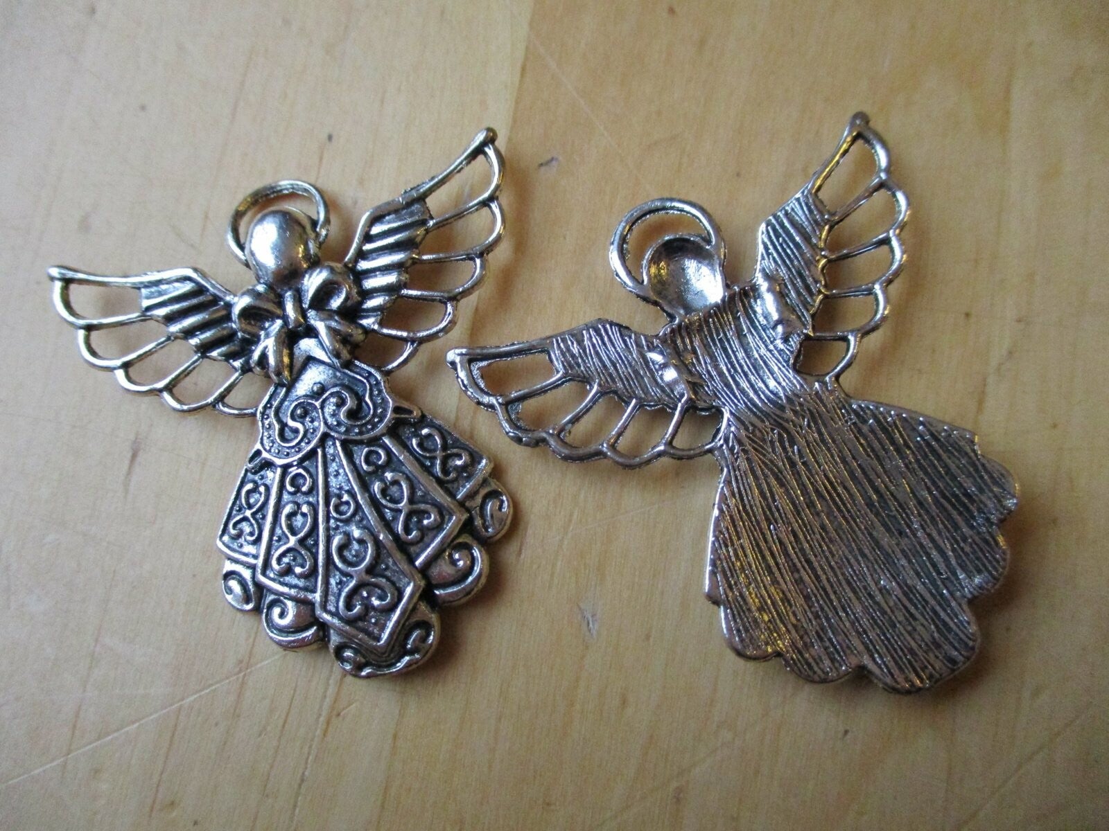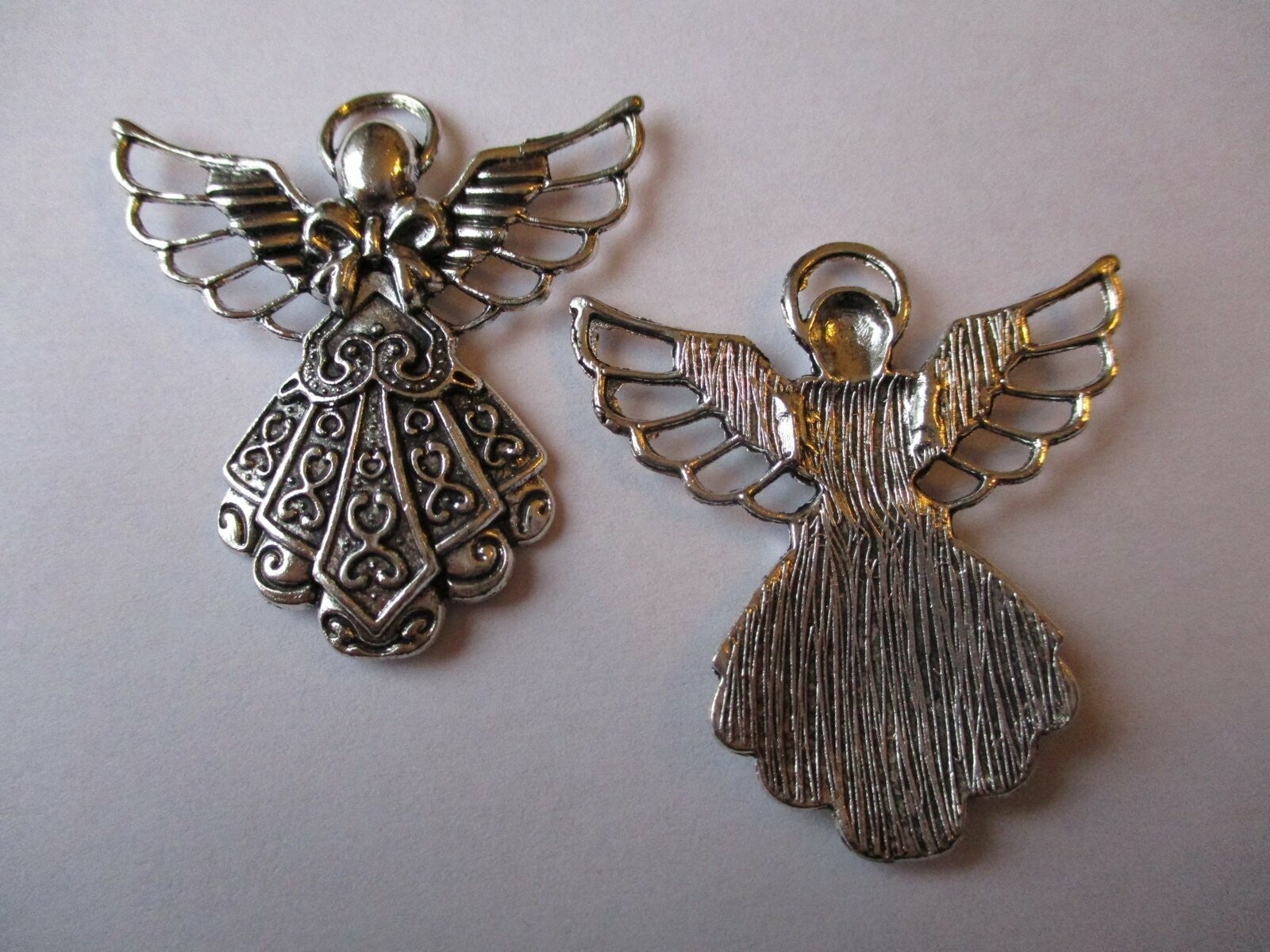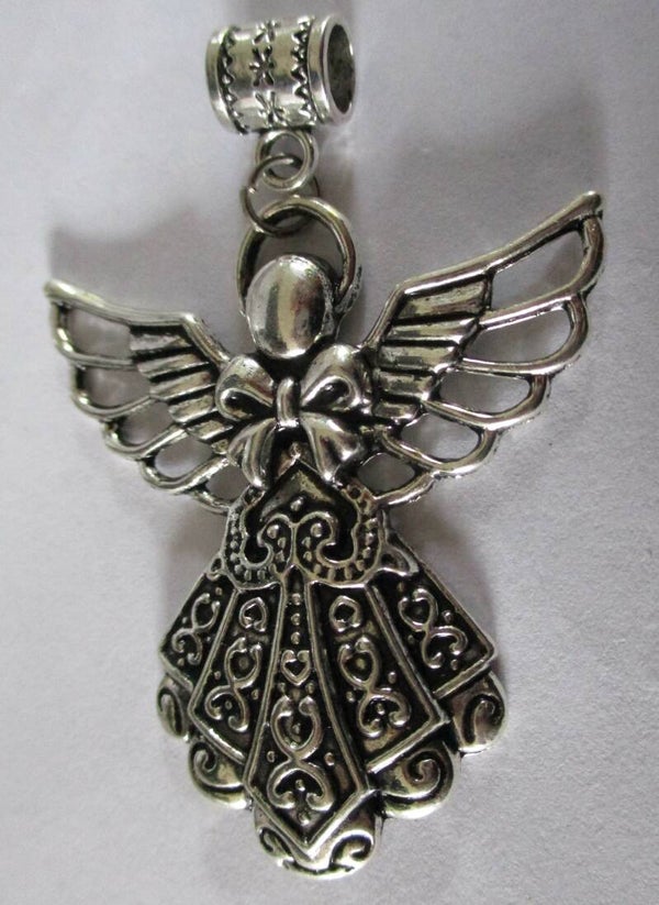 Een mooi gedecoreerde engel als hanger in twee formaten. De kleine engel is 25 x 16 mm groot, de grote engel met een buisje is de grote engel 52x39 mm lang. Beiden zijn aan de achterkant niet gevormd en licht bol.
