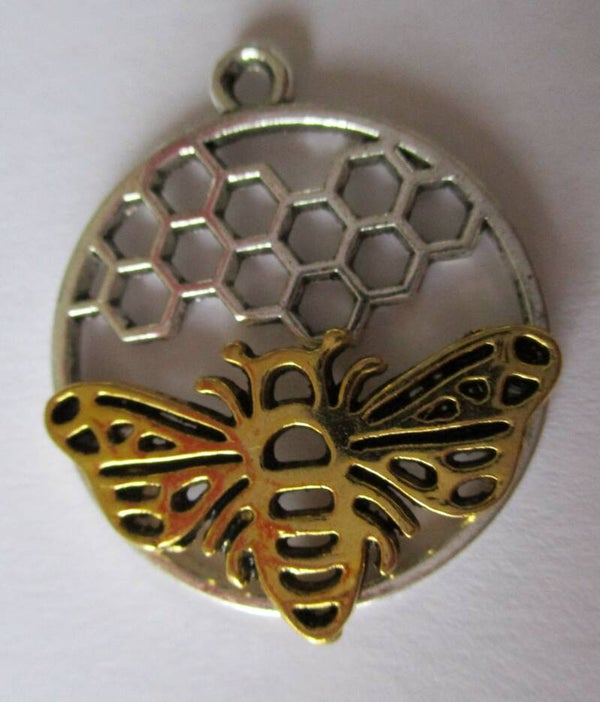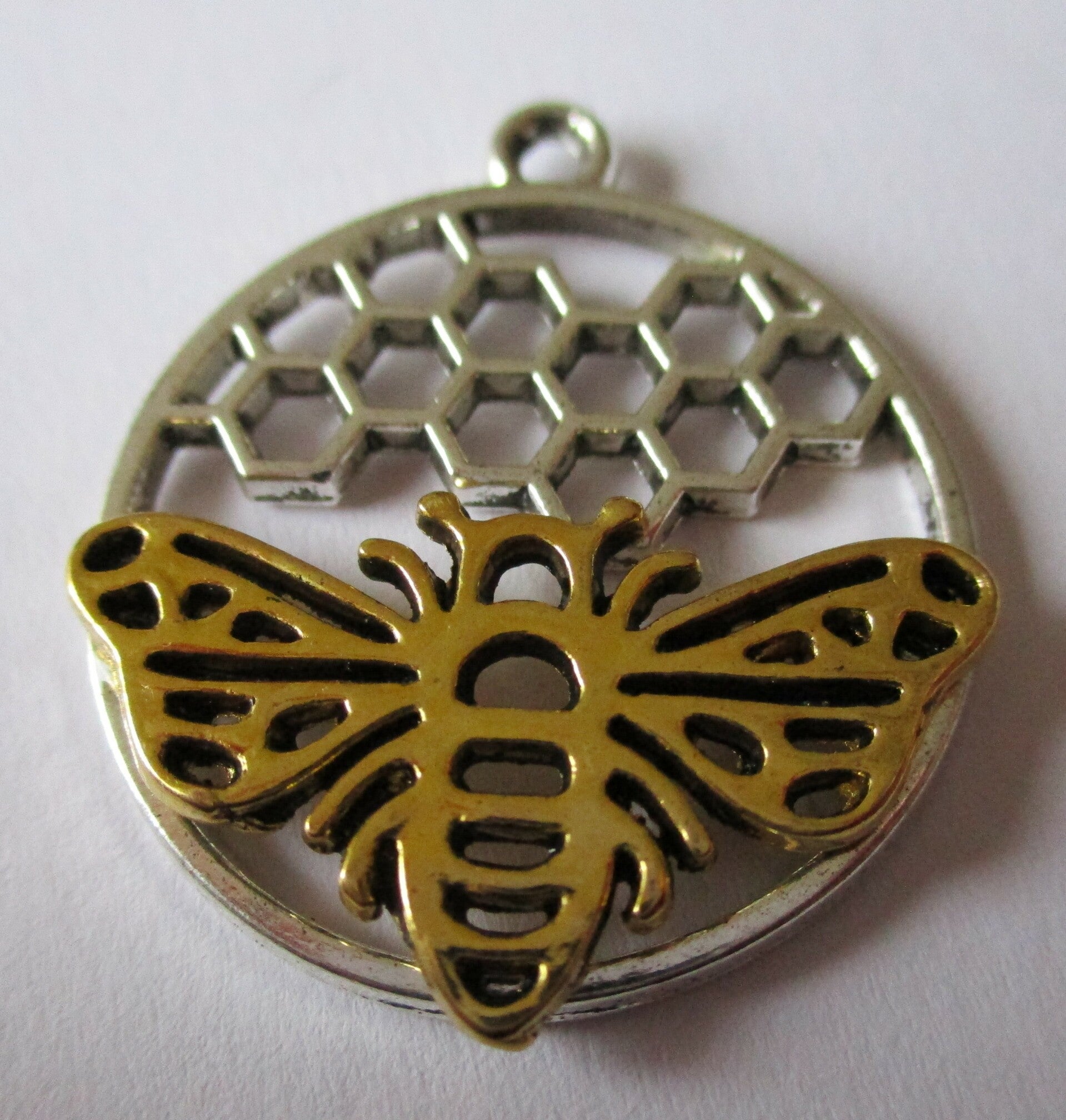 Een hele mooie tweekleurige hanger van een zilverkleurig bijenraat en een mooie goudkleurige bij erop. De hanger is 29 x 25 mm groot en wordt per stuk verkocht.