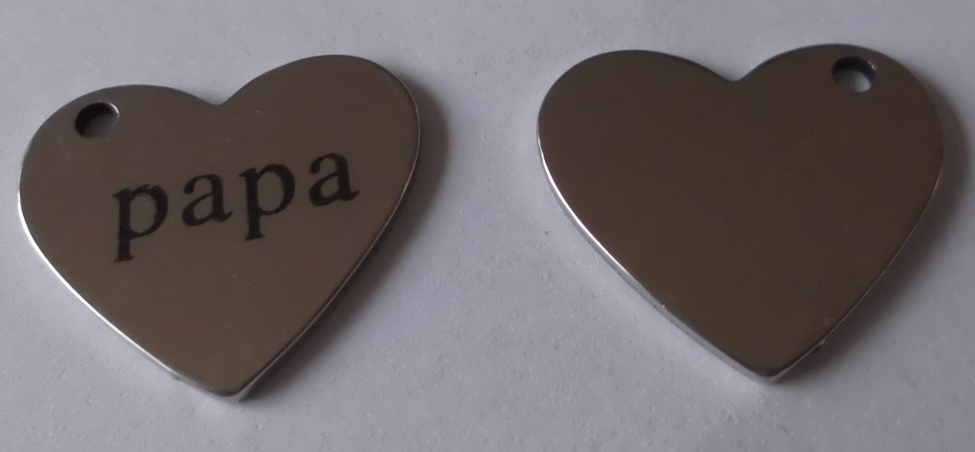 Een mooi strak vorm gegeven roestvrijstalen (rvs of stainless steel) hartje met het woord 'papa' erin. Erg leuk als cadeautje voor een jonge vader, voor vaderdag of een verjaardag van een vader. Een hanger die prima past aan een armbandje, ketting of bijv. een sleutelhanger. De hanger is 2 x 2 cm groot.