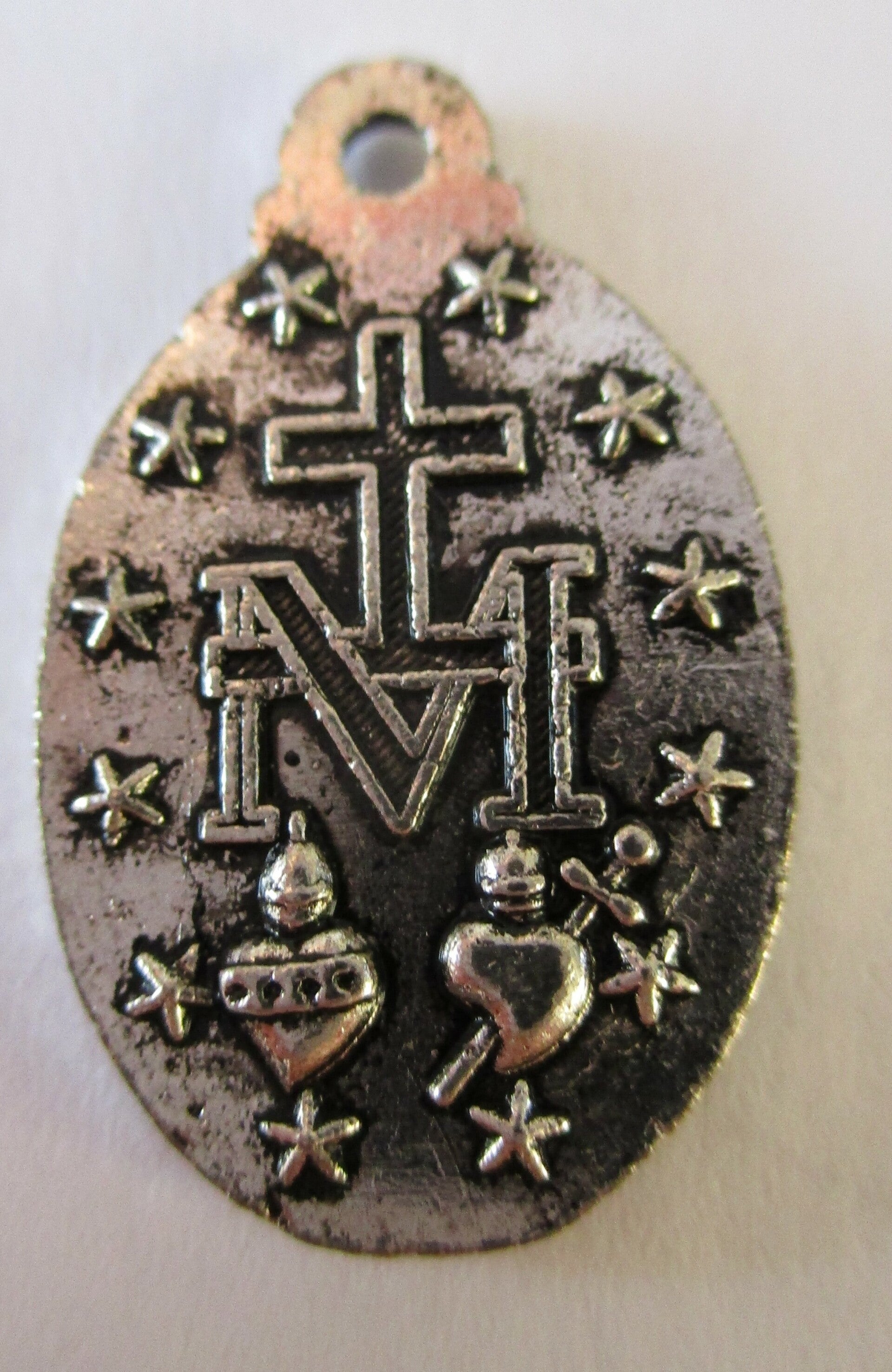 Een relatief kleine ovale bedel in antiek zilver kleur. De bedel is 2,2 x 1,4 cm groot inclusief oogje. Op de voorkant staat een tekst met een religieus Jezus beeld en op de achterkant religieuze initialen.