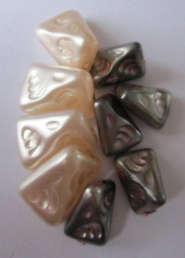 Een beetje apart gekleurde en gevormde kunststof kralen. De kralen hebben een soort van parelmoerglans en zijn beige en goudbruinachtig gekleurd. Ze zijn aan alle kanten driehoekig, waardoor een sieraad een heel apart uiterlijk krijgt.