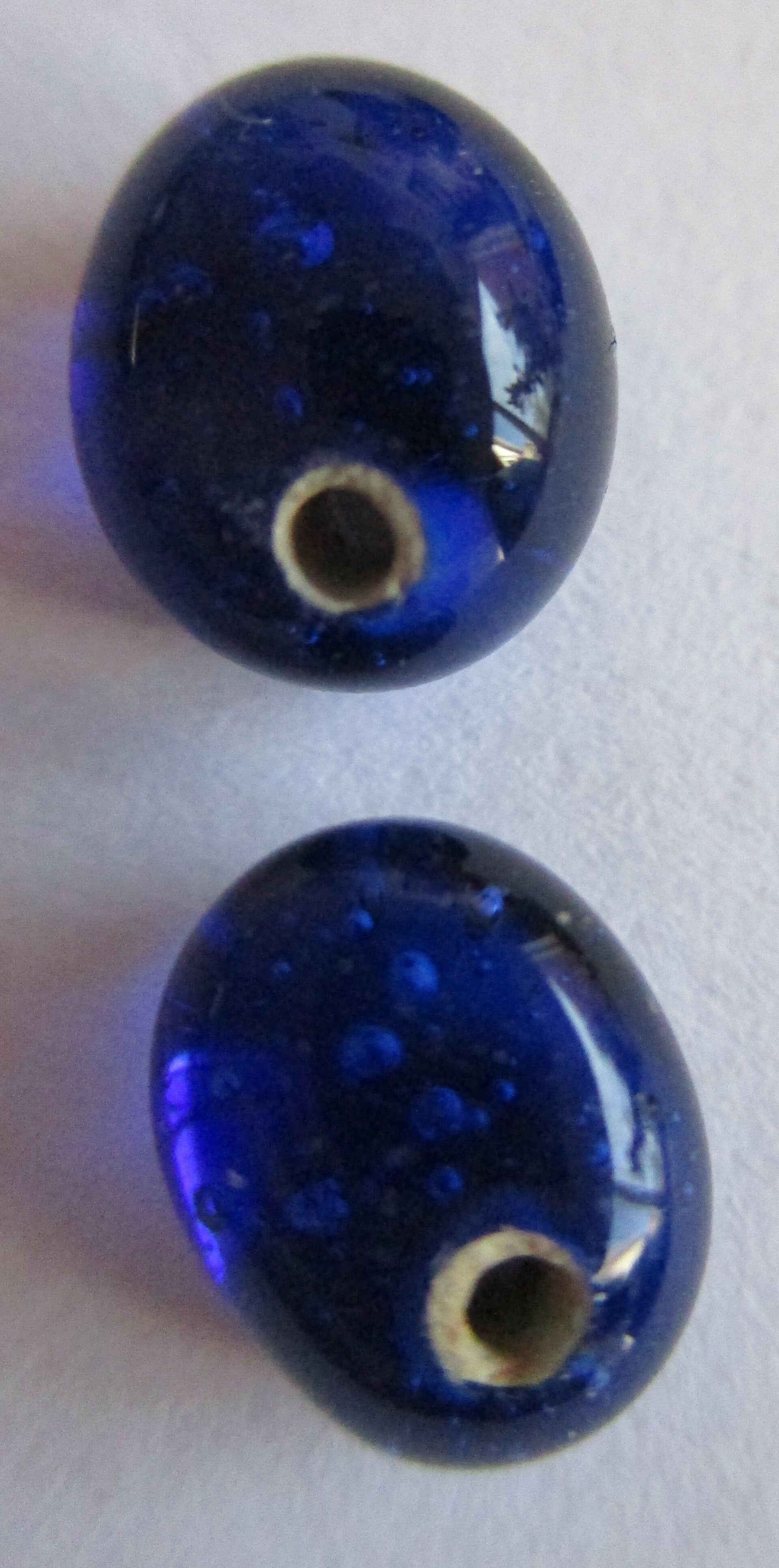 Een leuk blauw kraaltje die een apart effect geeft, omdat het rijggat een beetje assymetrisch in de kraal zit. Het zijn handgemaakte kraaltjes met een keramieke kern van ongeveer 9 x 6 mm groot.