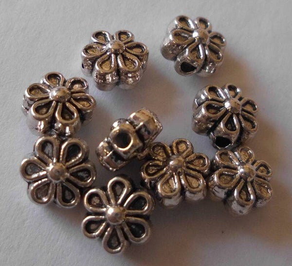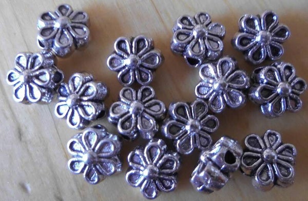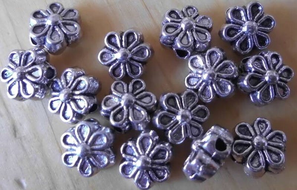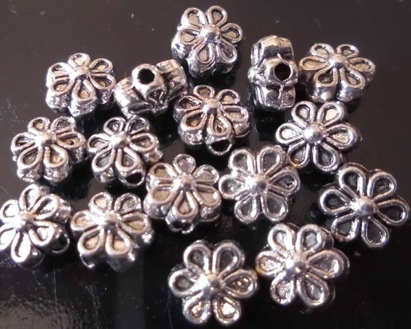 Leuke kleine kralen in de vorm van een bloemetje. De kralen hebben een oud zilverkleur en zijn 6 mm groot. Een kraal die vooral als afwisseling in een ketting of armband het heel goed doet. Perfect in combinatie met gekleurde kralen.