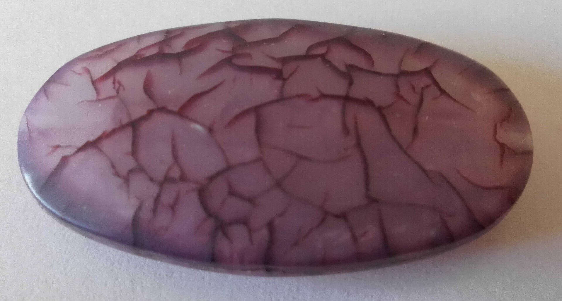 Heel aparte, grote kunststof kralen. Ze zijn vrij plat en paars gemeleerd van kleur. De kralen zijn 35 x 20 x 5 mm groot en hebben een klein rijggat. Deze kralen staan erg mooi bij zwart, wit of amethist kleurige kralen.