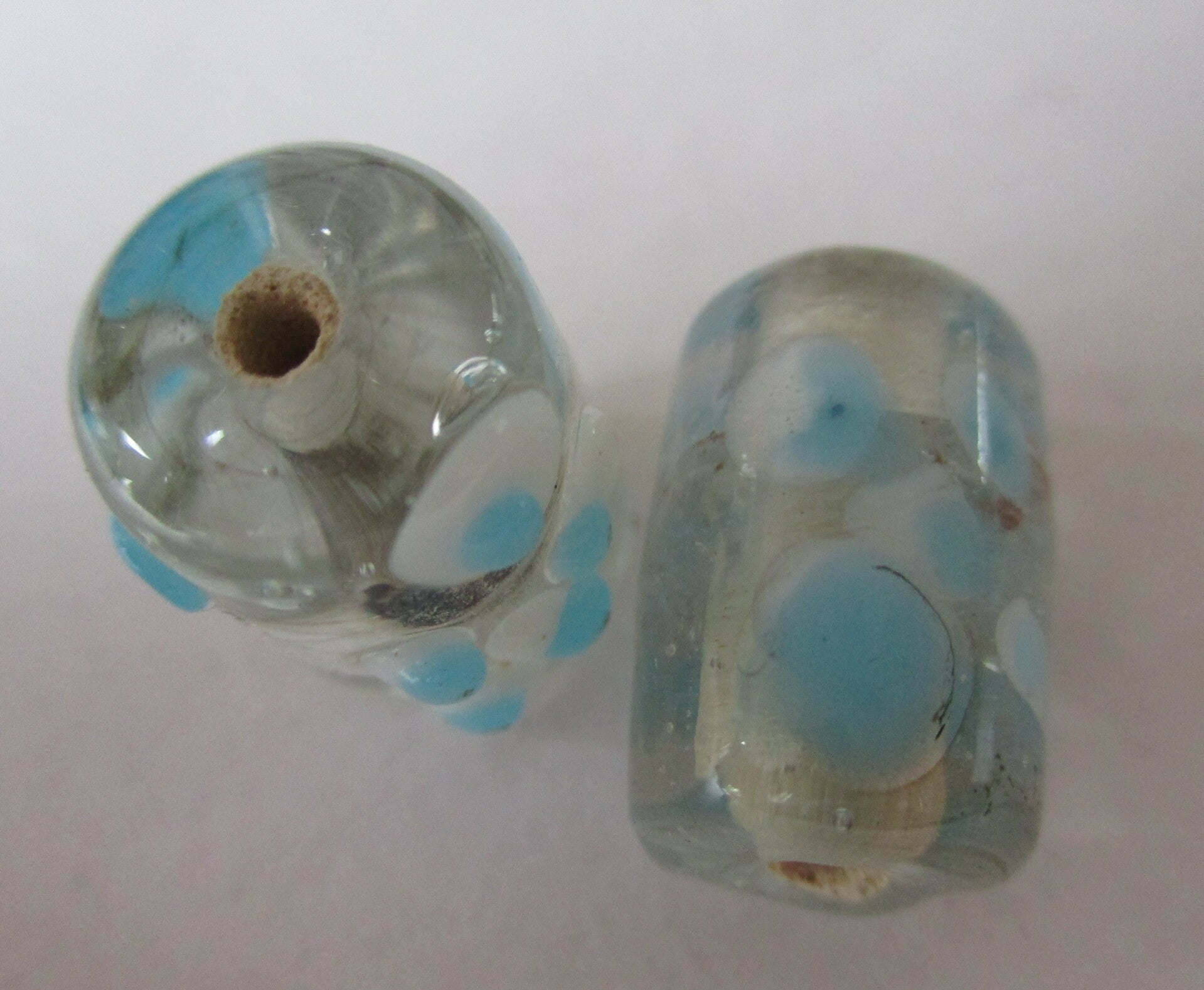 Een handgemaakte glaskraal, gemaakt van transparant glas met een keramieke kern en lichtblauw met witte stippeltjes erop. De kralen zijn niet gelijk van vorm en grootte, van mooi ovaal tot tonvormig. Ze zijn tussen de 15 en 20 mm groot.