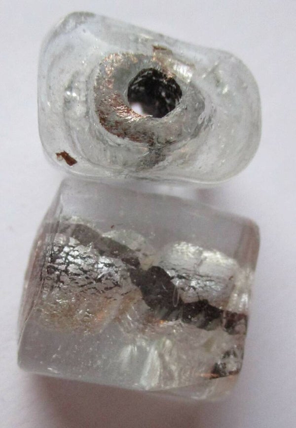 Handgemaakte grote glaskralen met een kern van zilver met zwarte folie. De kralen zijn een beetje onregelmatig van vorm en formaat, maar ongeveer 2 x 2 x 1,2 cm groot.