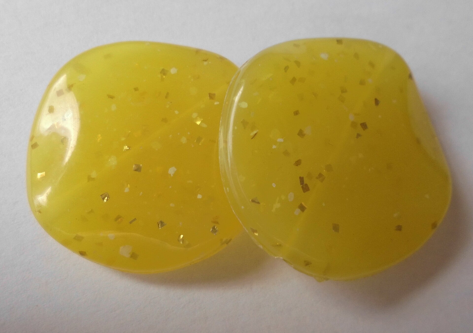 Een hele aparte kunststof kraal. De kraal is geel met glittertjes erin verwerkt en 30 x 7 mm groot. De kraal heeft een soort vierkant midden met aflopende zijkanten, waardoor bijna een golvend effect lijkt te hebben.