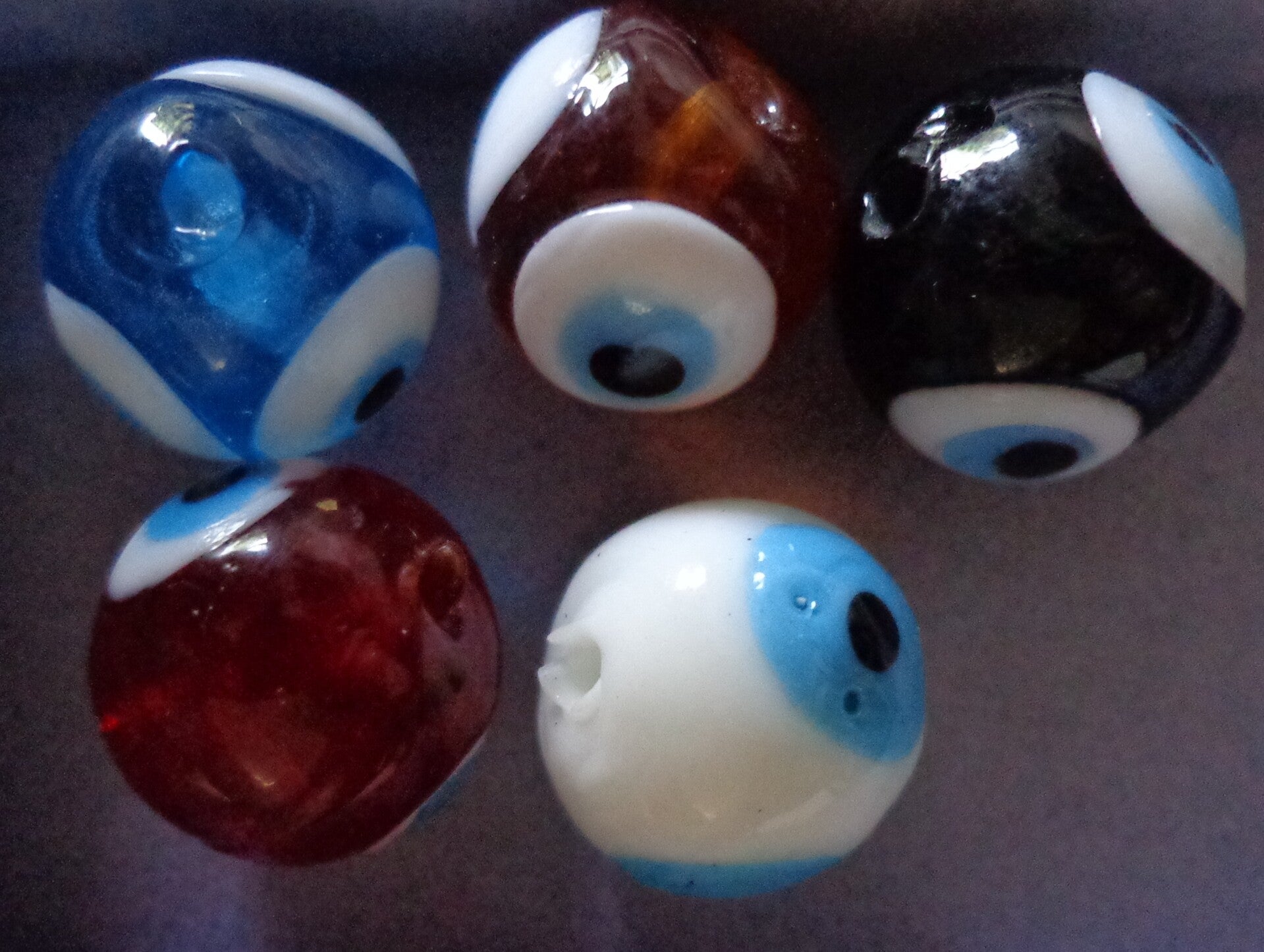 Verschillende kleuren glaskralen met een geluksoog erin. Deze kralen verwerkt in een mooi zelfgemaakt sieraad moet de draagster wel geluk brengen, volgens het bijgeloof.