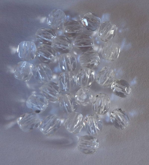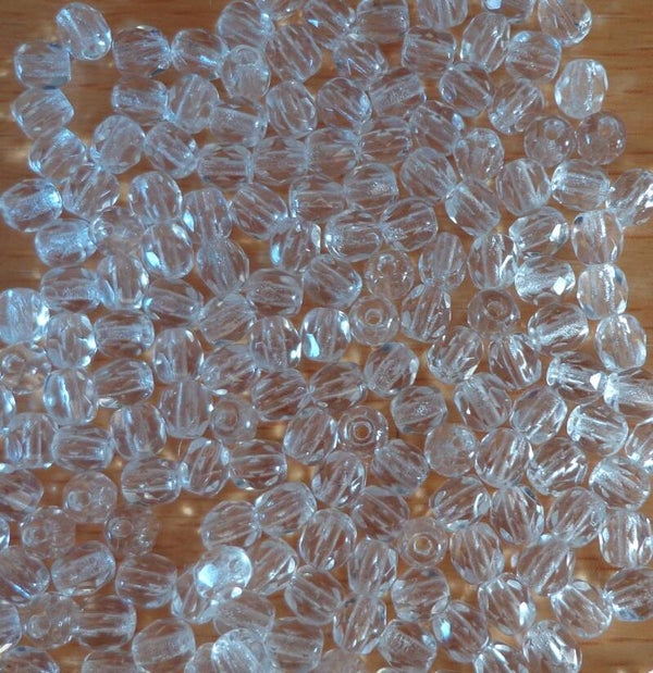 Iets ovale glazen facetkralen die helder zijn geslepen. Ze zijn ongeveer 4 x 5 mm groot en worden per kraal verkocht.