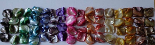 Onregelmatig gevormde schelpkralen in 10 kleuren. Ze hebben een prachtige glans en staan heel bijzonder aan uw zelfgemaakte sieraad. Ze zijn variabel van grootte tussen 1,5 en 2,2 cm groot.