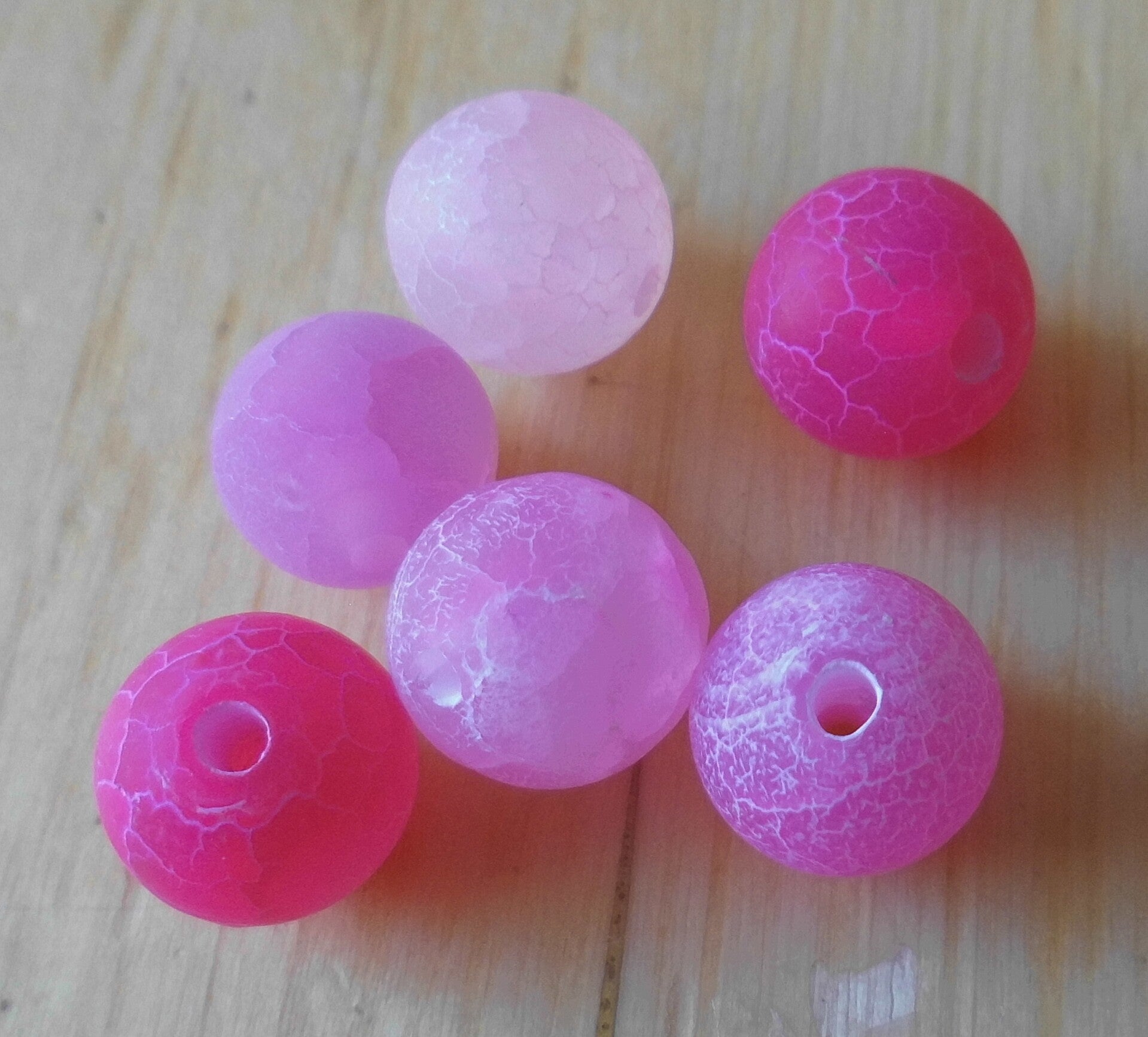 Aparte gemeleerde roze kralen gemaakt van fluoriserend agaat. Momenteel zijn er alleen nog bijna witte kralen over. De kralen zijn 8 mm groot en passen erg mooi bij zwarte, witte, zilver of goudkleurige kralen. Ze lijken een soort craquelé effect te hebben. Dit is ontstaan, omdat de kralen van natuursteen zijn gemaakt en niet gepolijst.