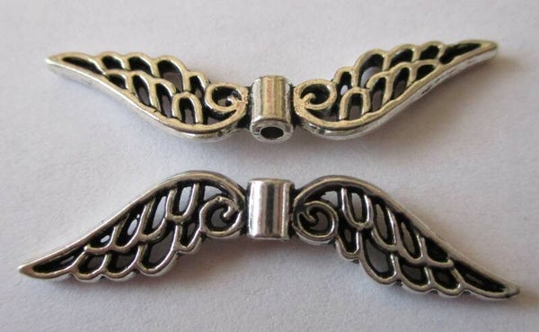 Mooi afgewerkte een beetje stoer uitziende vleugels. Ze zijn zilverkleurig en gemaakt van nikkelvrij metaal 32 x 7 mm groot.