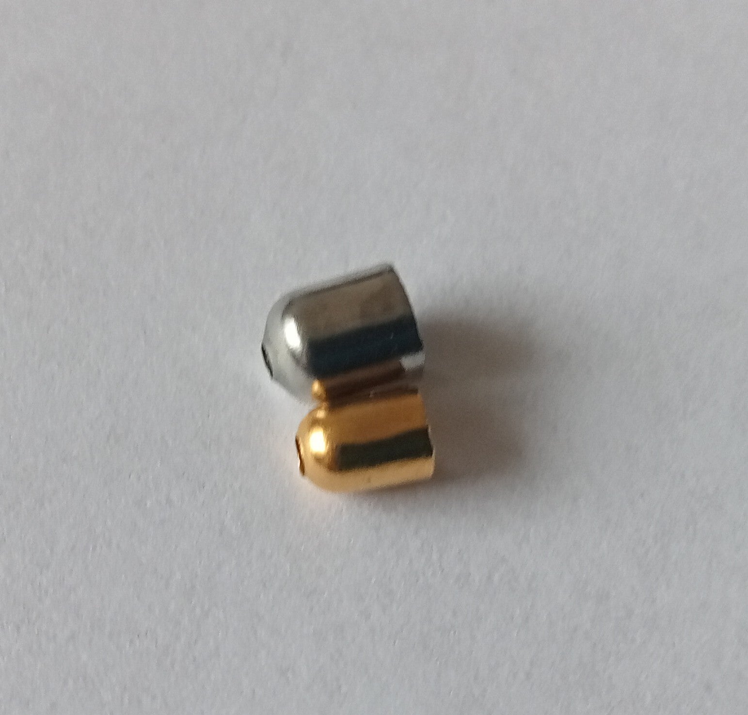 Kleine eindkapjes om een zelfgemaakt sieraad mooi mee af te werken. De zilverkleurige kapjes zijn ongeveer 5 x 6 mm groot, de goudkleurige kapjes zijn 5x3 mm groot en hebben een rijggat van ongeveer 1 mm.
