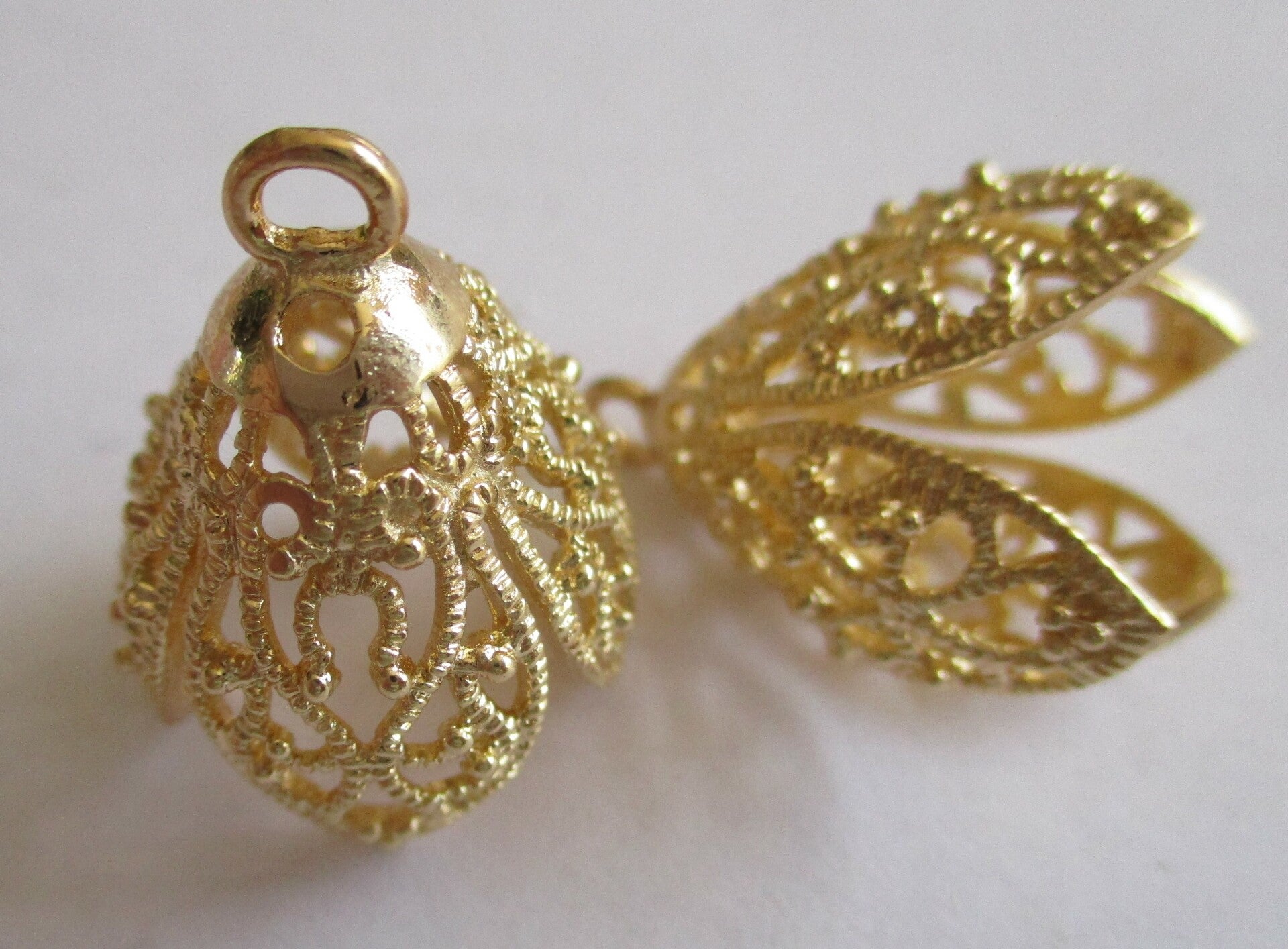 Mooie goudkleurige hanger annex kapje. De hanger is 26 x 17 x 17 mm groot. Er past een 10 tot 12 mm grote kraal in. De blaadjes kunnen wat bij gebogen worden, zodat de kralen vastgeklemd worden. Naast het oogje van de hanger zit ook een rijggat waar een nietstift of draad door vastgemaakt kan worden.