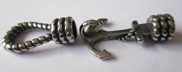Een handige sluiting voor een armband Een haakje met een lusje om aan te haken. De sluiting heeft de vorm van een anker met touwlus en is gemaakt van Roestvrij Staal (RVS of stainless steel), wat minder allergische reacties oproept.
