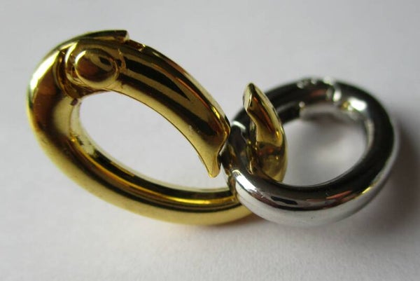 Ovale muskettonhaken van 20 x 15 mm groot. Geef bij uw bestelling door of u de goud of zilverkleurige wilt ontvangen.