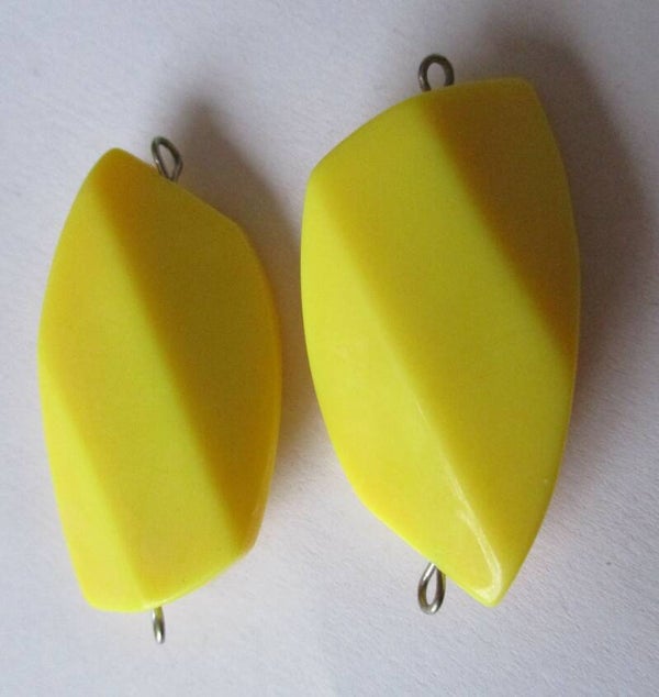 Een heel apart tussenzetsel van geel kunststof gemaakt. De vorm van het tussenzetzel lijkt een beetje op een stuk mango, is 4,5 x 2,3 cm groot en heeft aan beide kanten een metalen oogje.