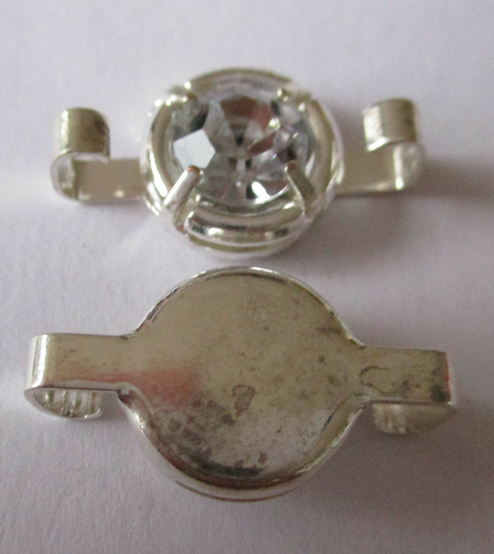 Een mooie verzilverde verdeler met stras steentje en klemmetjes aan de zijkant, zodat het ook heel mooi tussen iets dikkere draden geklemd kan worden. De verdeler heeft een glad afgewerkte achterkant. De verdeler is 2,1 x 1,2 cm groot.