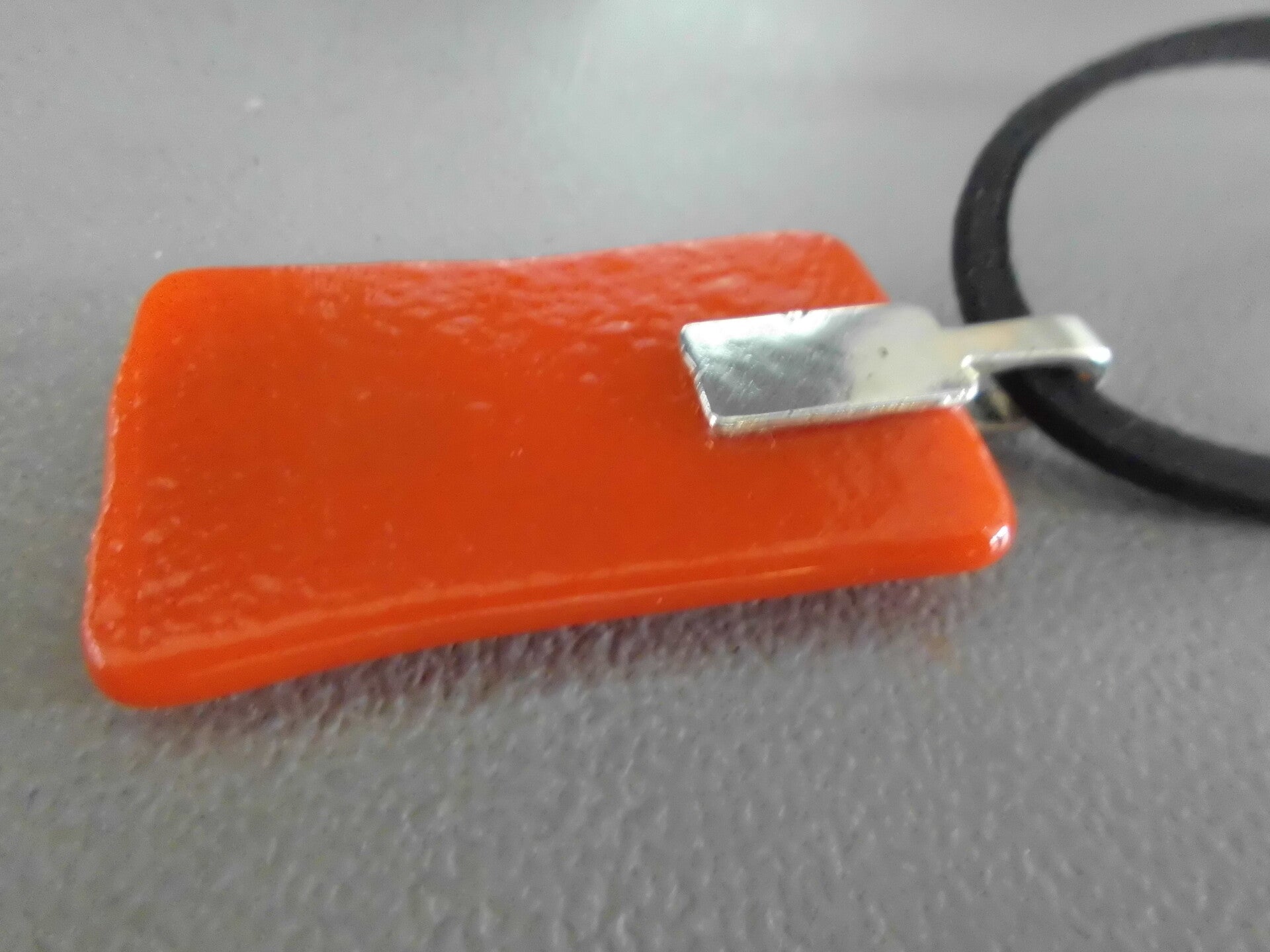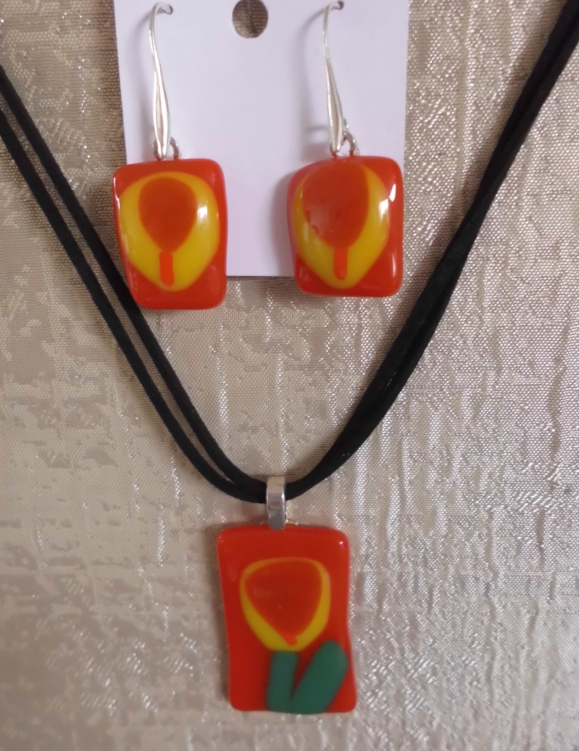 Een zomerse set van een ketting en oorbellen, gemaakt van oranje glas met daarin een soort gele met oranje tulp. Het geheel geeft een vrolijk zomerse uitstraling. Erg leuk in de lente als de eerste zomerse dagen er zijn of in de zomer bij een witte blouse of jurk.
