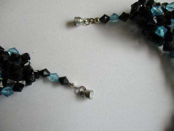 Een bijzondere en unieke ketting gemaakt met de rijgtechniek van de Russische spiraal. De ketting is gemaakt van zwarte en blauwe kunststof bicone kraaltjes en is 49 cm lang.