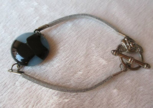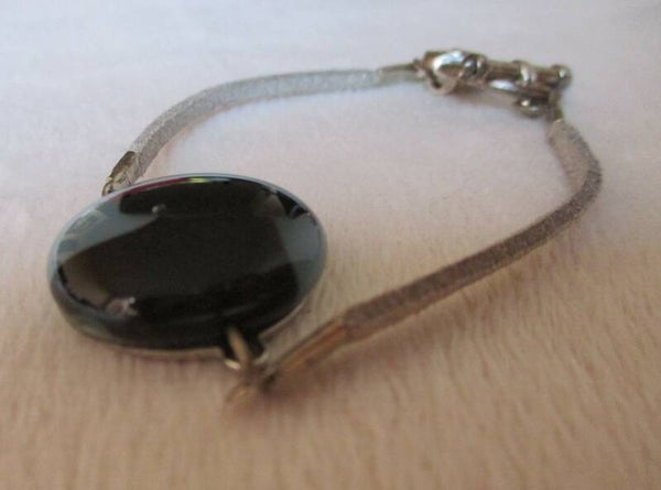 Een bijzondere armband door de kleur, vorm en materiaal. De armband is gemaakt van zilverkleurig namaak suede, daartussen een tussenzetsel van RVS (roestvrijstaal of stainless steel), een top van zwart met grijs glas en een kapittelslot.