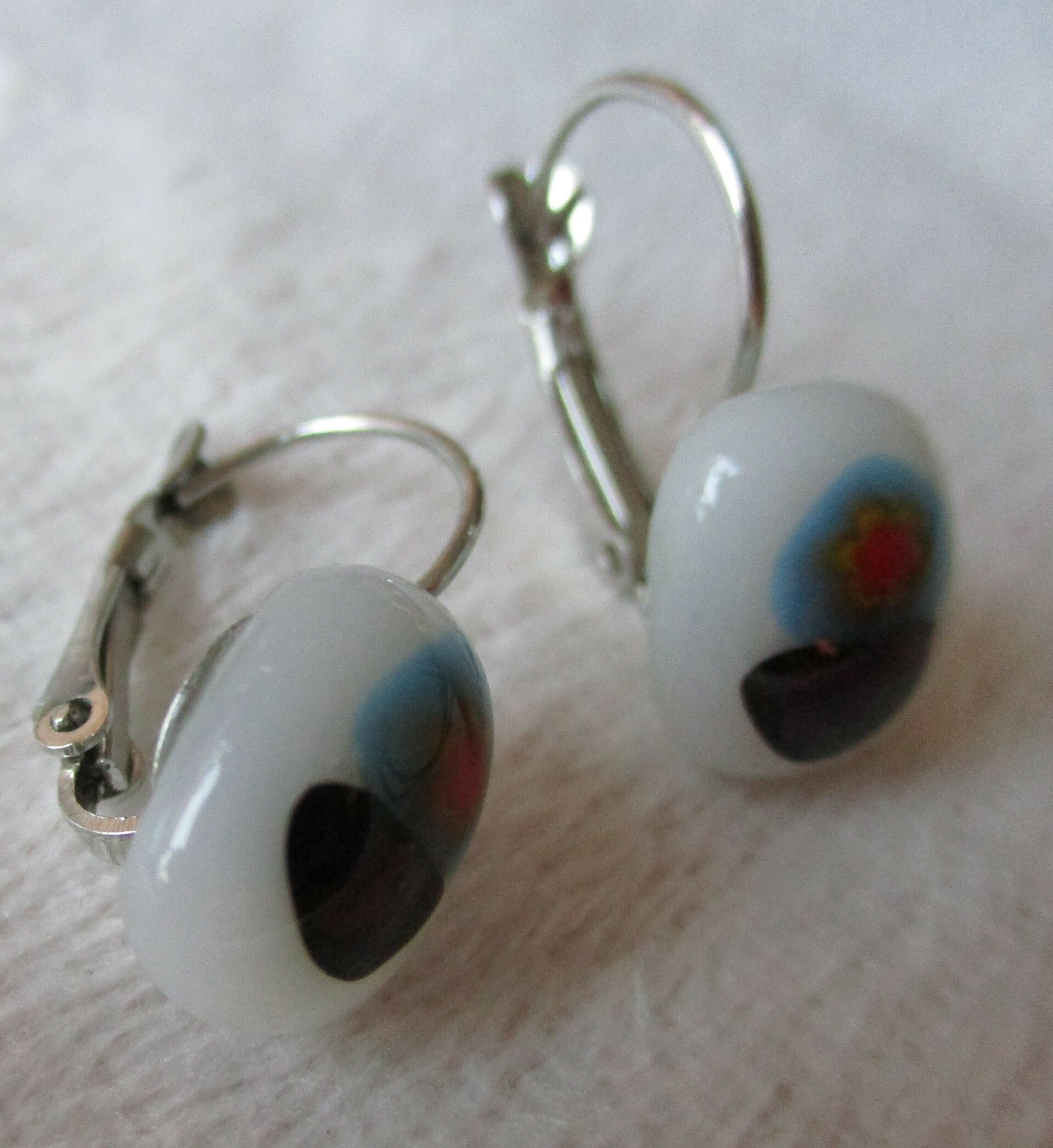 Leuke, zomers gekleurde, ovale klapoorbellen, gemaakt van wit glas met daarop vlakjes van vrolijke kleurtjes als een soort bloemetjes. De oorbellen zijn ongeveer 2 x 1 cm groot en gemaakt van nikkelvrij materiaal. Let op: Dit zijn geen clips!