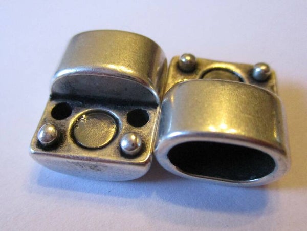 Een zilverkleurig magneetslot voor breed band of koord. Het slot is extra stevig door de kleine puntjes aan beide zijden die in elkaar vallen als het slot gesloten is. Gesloten is de buitenzijde van het slot 13 x 23 mm groot. Het is geschikt voor band van 10 x 8 mm met afgeronde hoeken.
