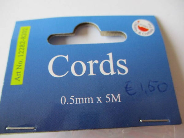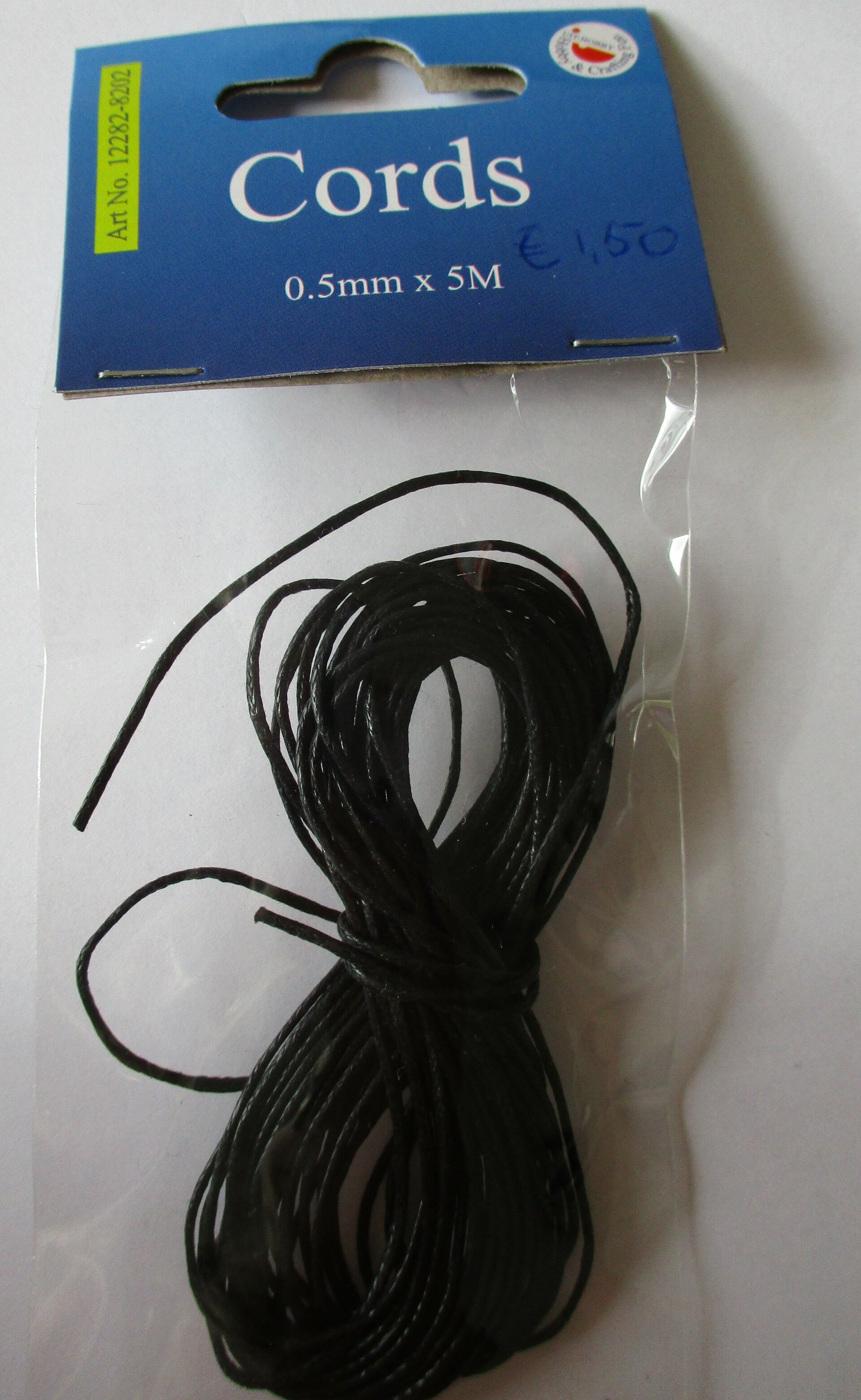 Mooi dun zwart waxkoord met nylon erin verwerkt, een beetje glanzend. Het waxkoord is 0,5 mm breed en 5 meter lang.