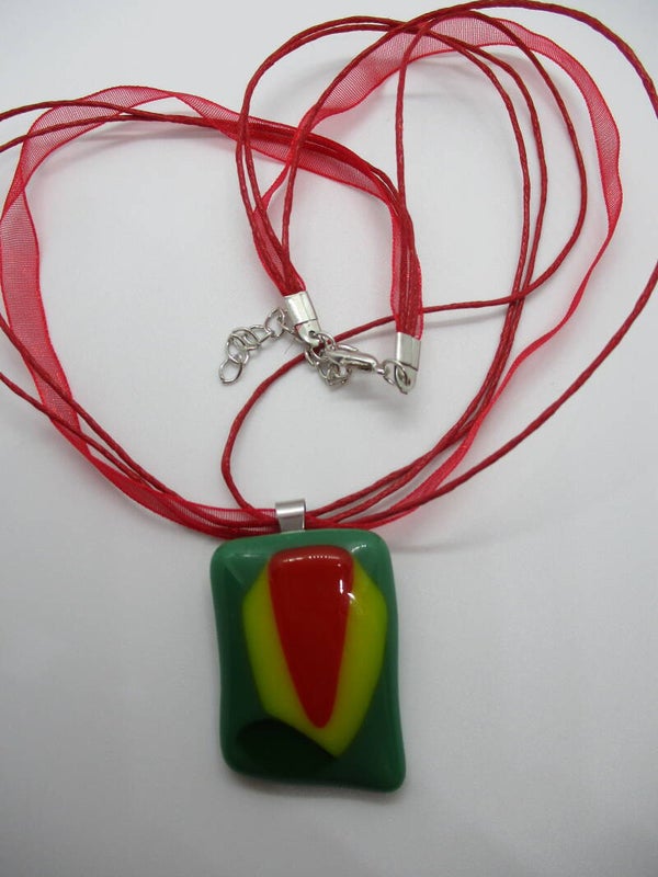Deze hanger past helemaal bij een voorjaarsoutfit. Gemaakt van groen glas met daarop een abstracte tulp van geel en oranje glas.