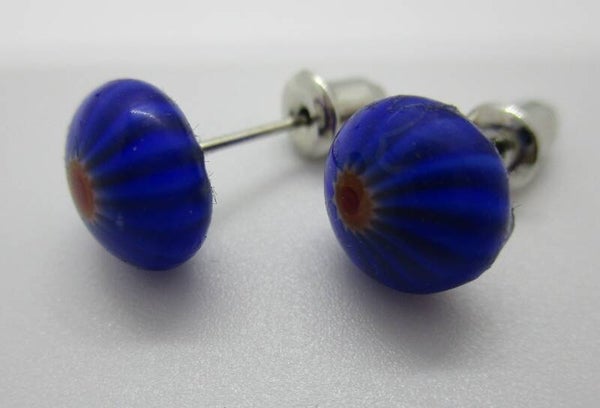 Bijzondere oorknoppen gemaakt van blauw glas met een klein geel/oranjerood hart. De oorknoppen hebben een diameter van ongeveer 1 cm (10 mm).