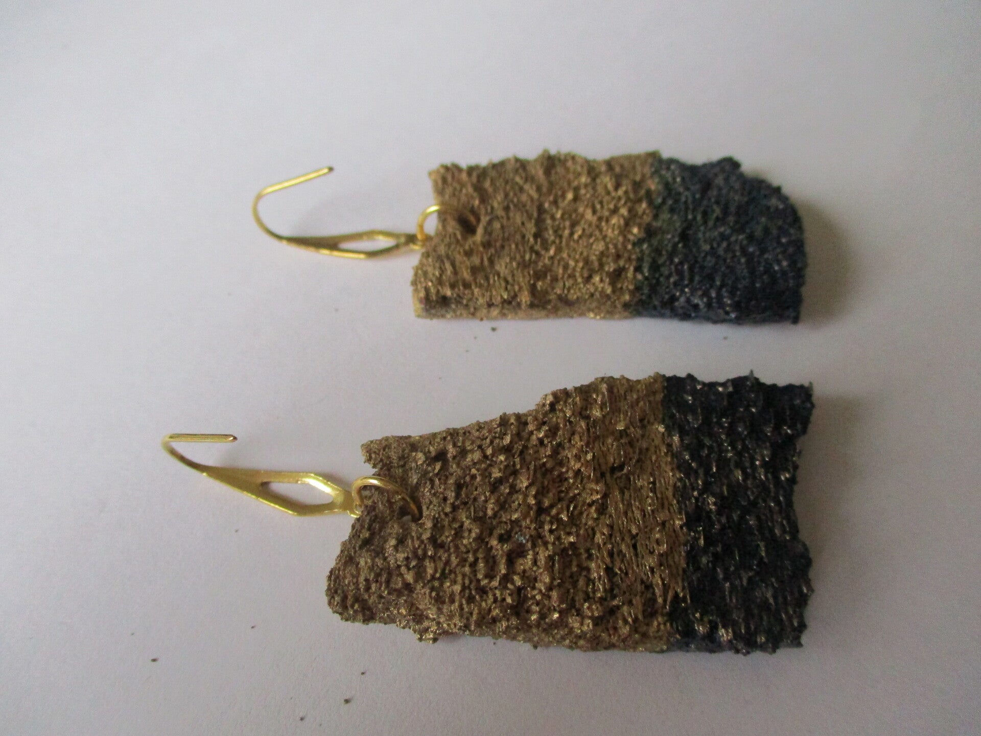 Bijzondere oorbellen, gemaakt van boomschors. De schors is eerst goed gedroogd, daarna gespoten en gelakt. Het zijn opvallende oorbellen die passen bij iemand die wel wat durft.