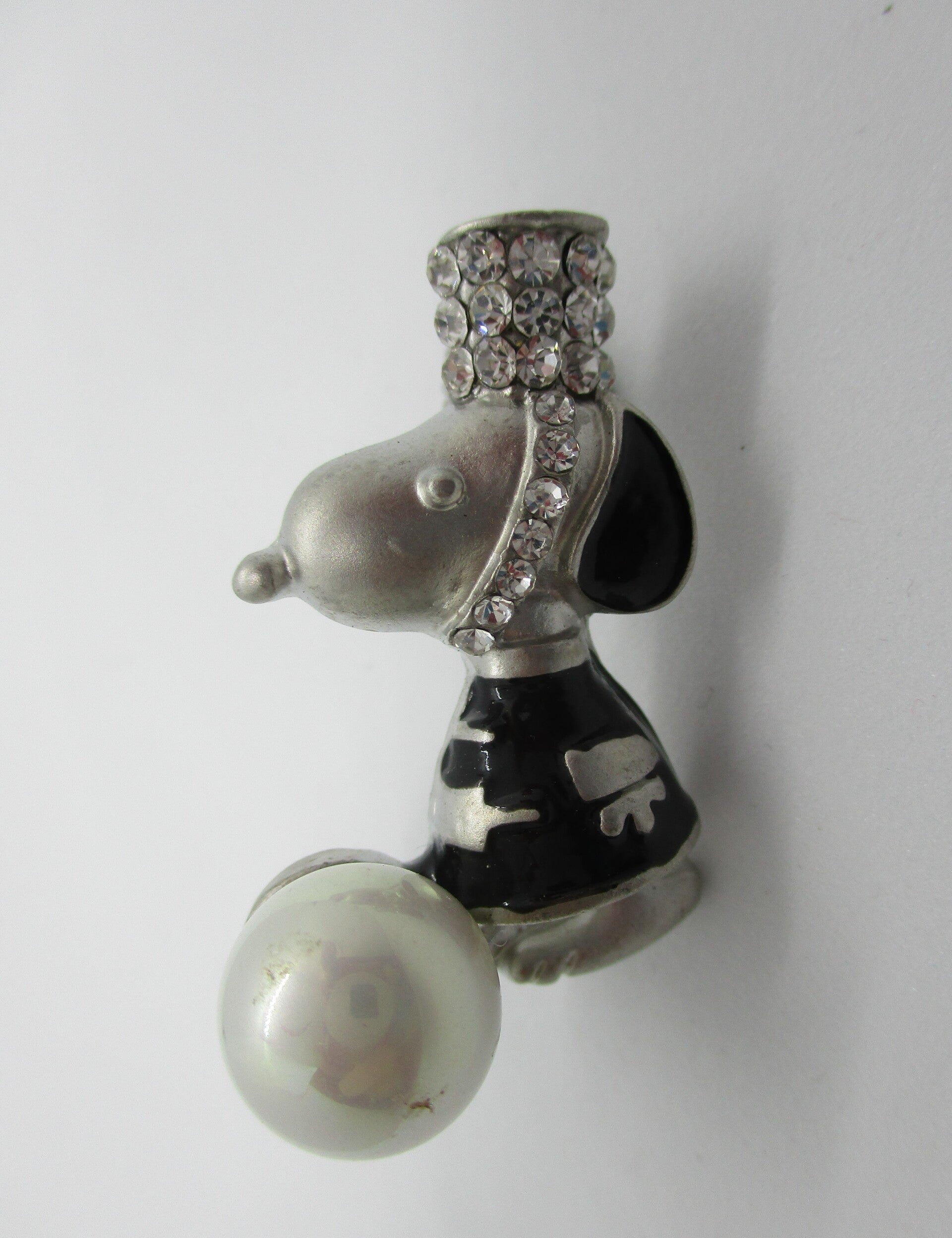 Een grappige broche van snoopy in winterstijl. De broche is zilver met zwart en wit gekleurd. De broche is ongeveer 30x20 mm groot. Het hoedje van snoopy heeft kleine stras steentjes, wat een leuk bling effect geeft.