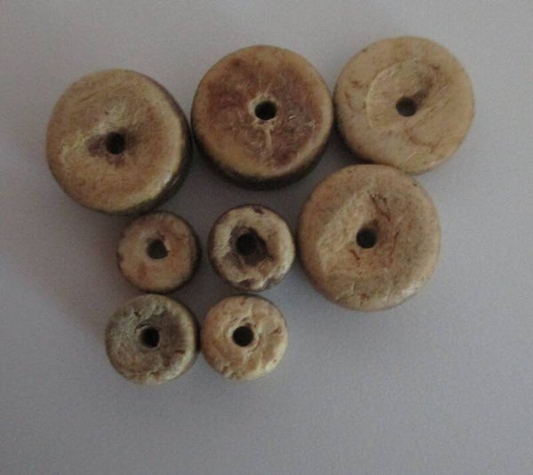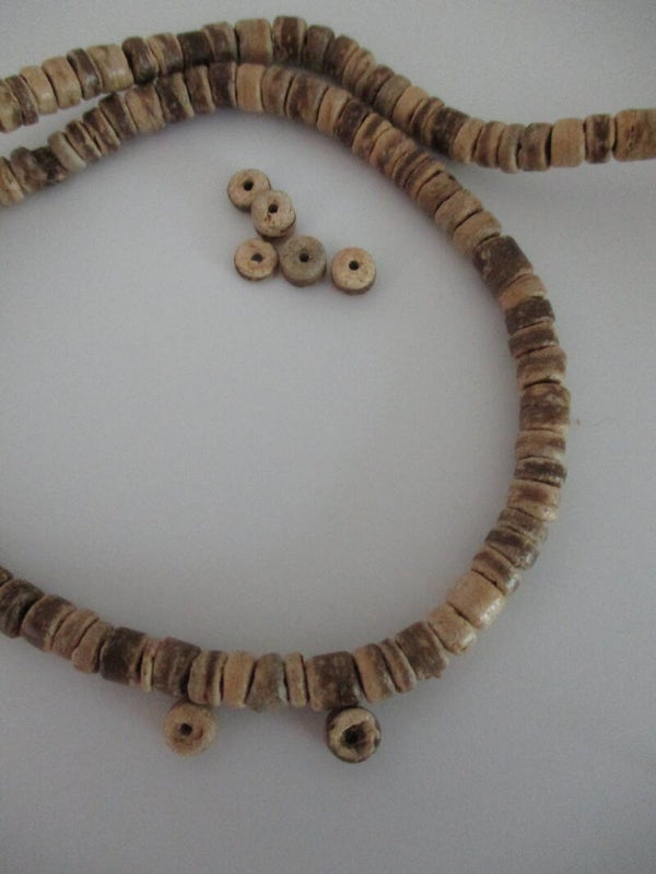 Heel natuurlijk uitziende kleine kralenschijfjes van kokosnoot. De kralen hebben een doorsnede van 5 of 8 mm. De dikte van de schijfjes verschilt, omdat het van natuurlijk materiaal gemaakt is.
