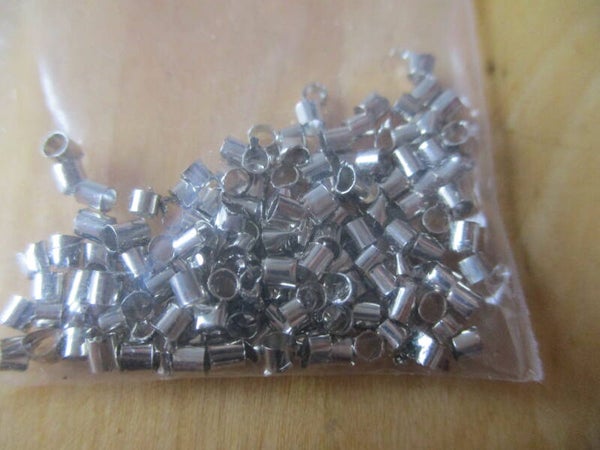 Een zakje met knijpkralen, buisjes van ongeveer 2,5 mm groot. In het zakje zitten ongeveer 100 knijpkraaltjes.